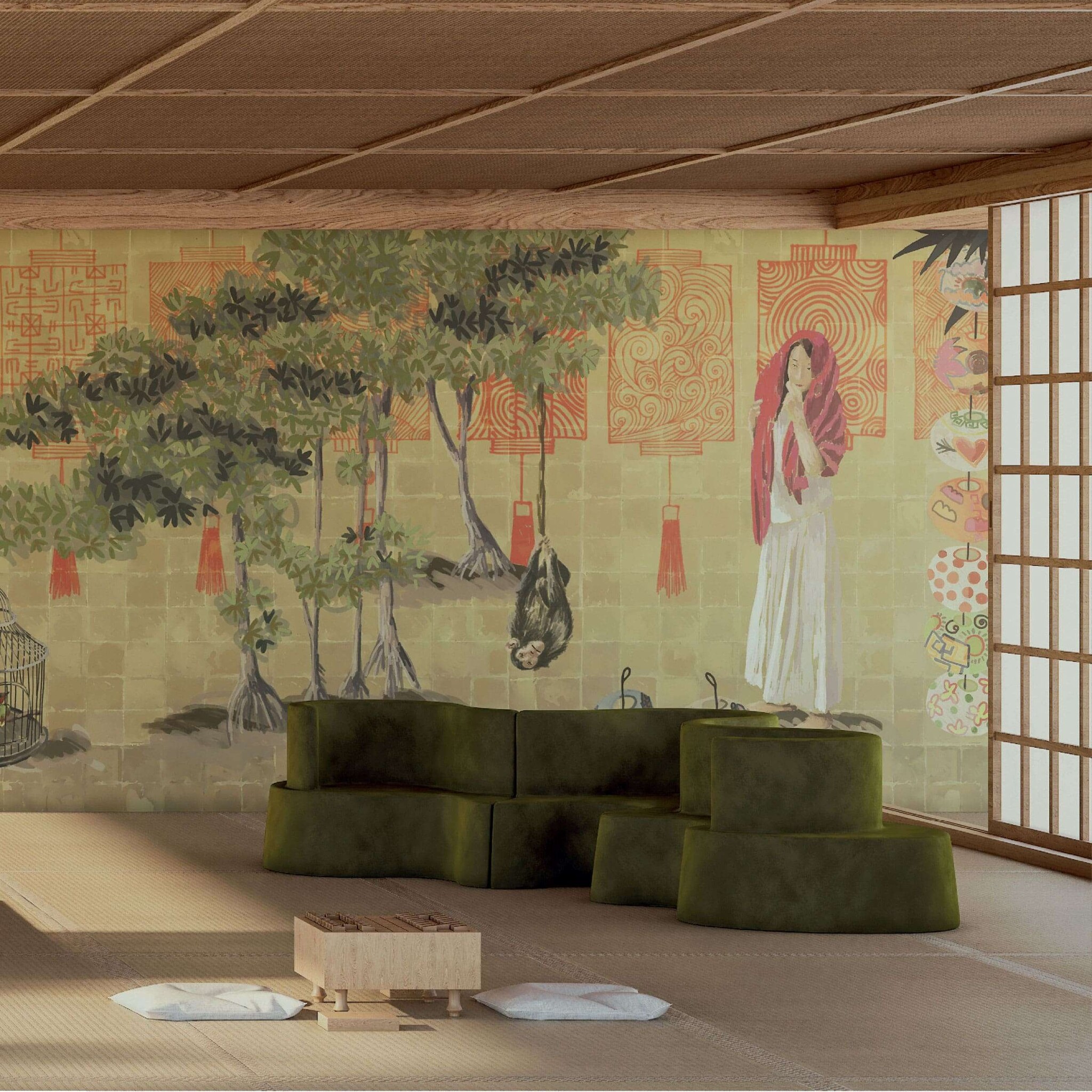 Panoramique Un Conte Fantastique van Elitis. Dit panoramabehang uit de 360 collectie heeft een oosterse setting. Een verrassend panorama vol cultuur en oosterse taferelen.