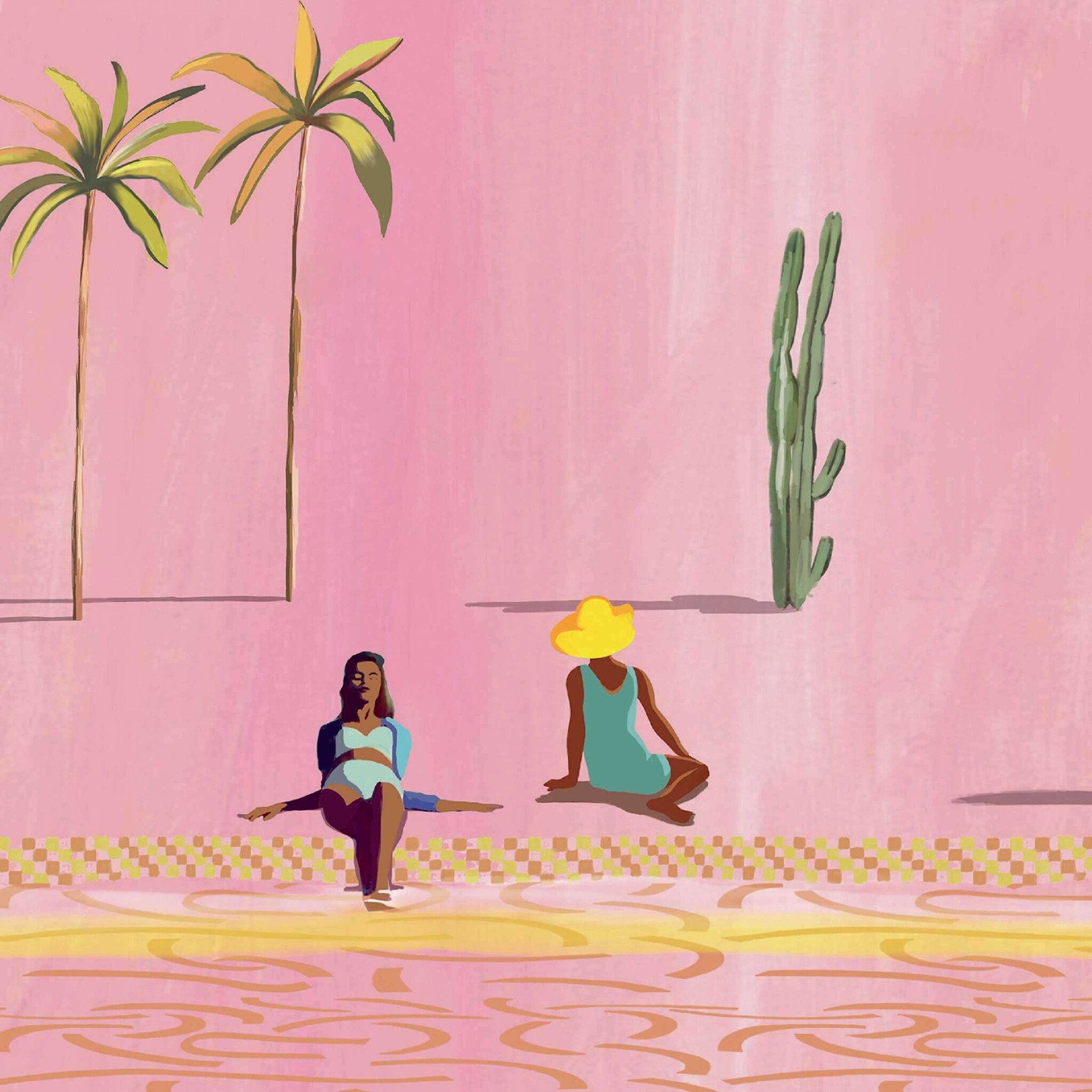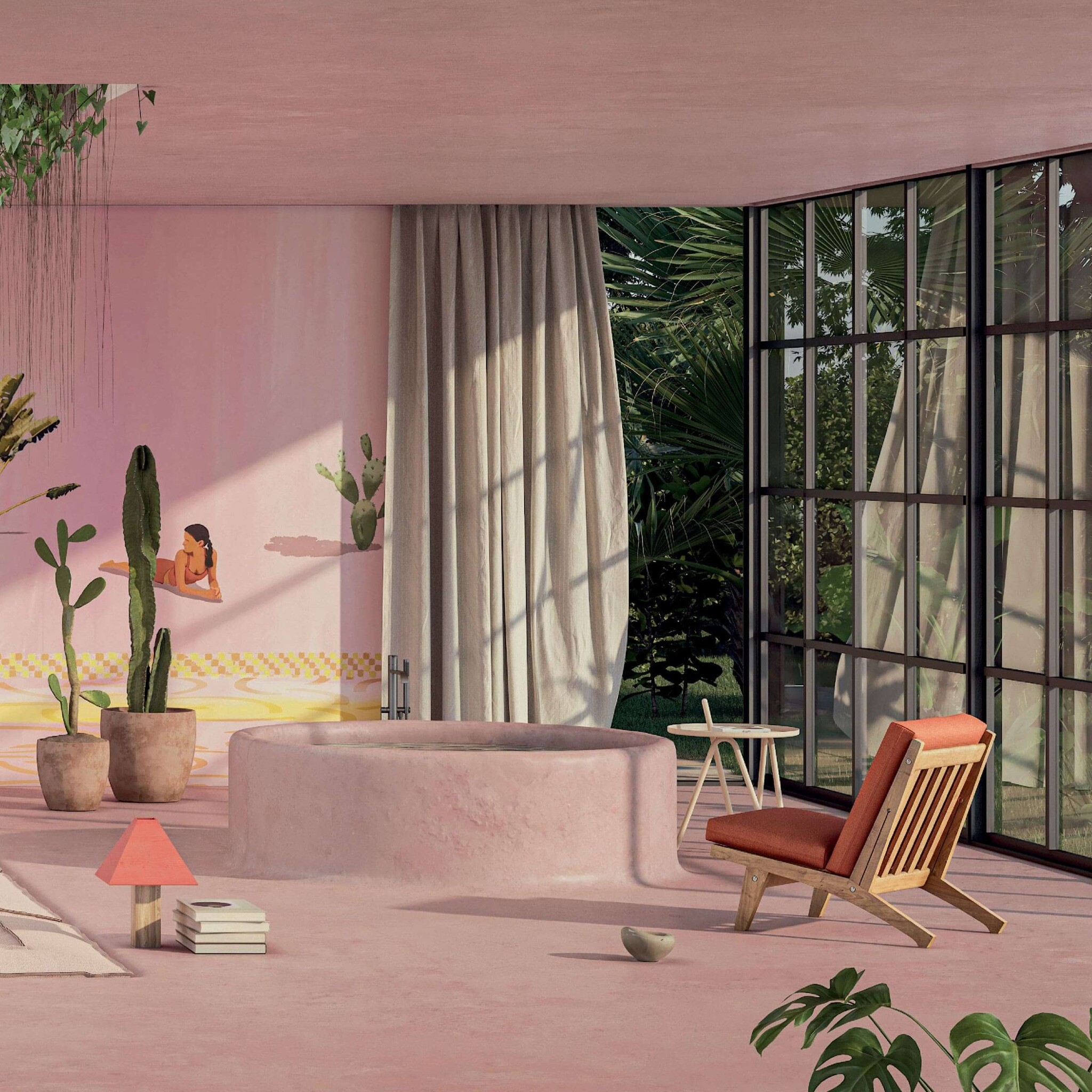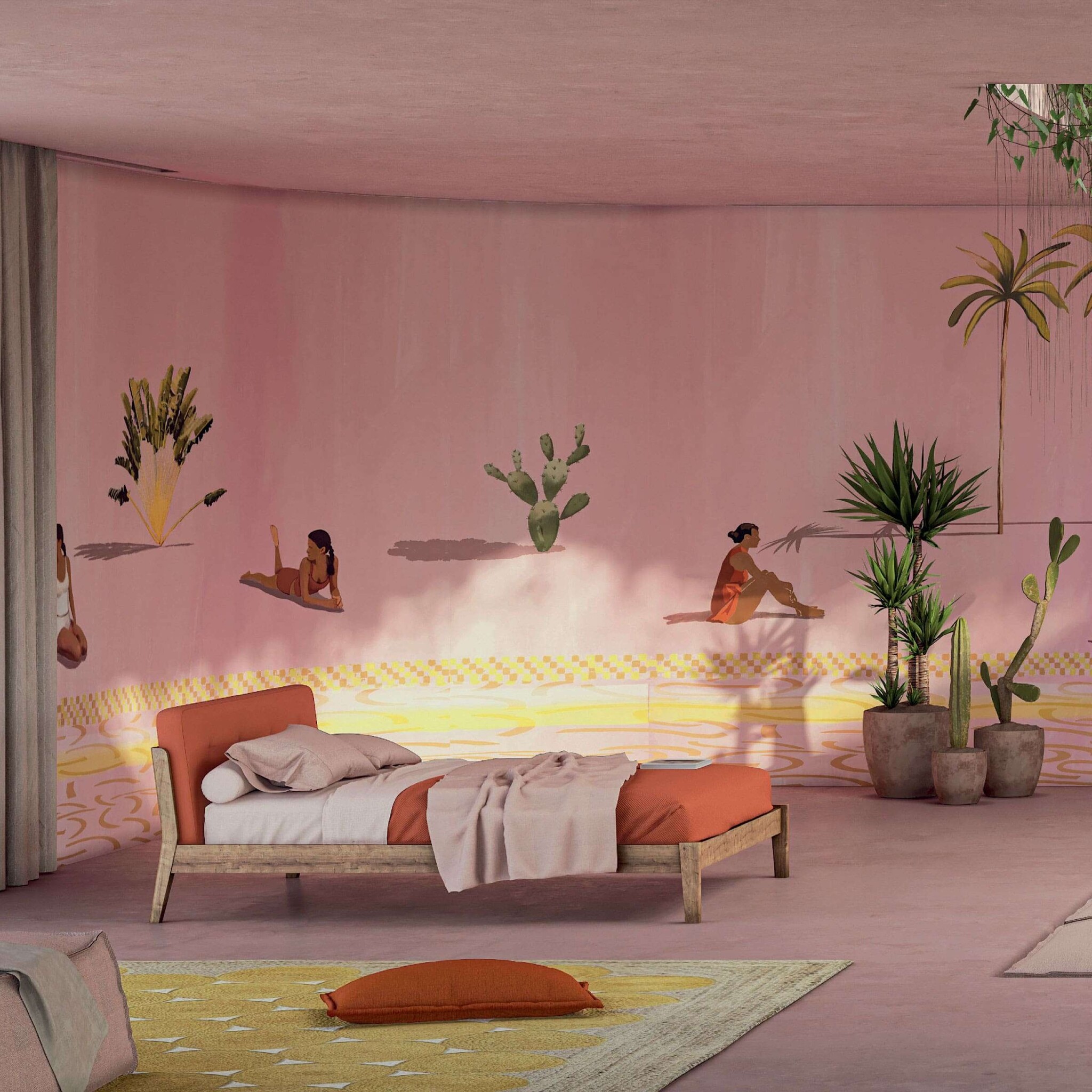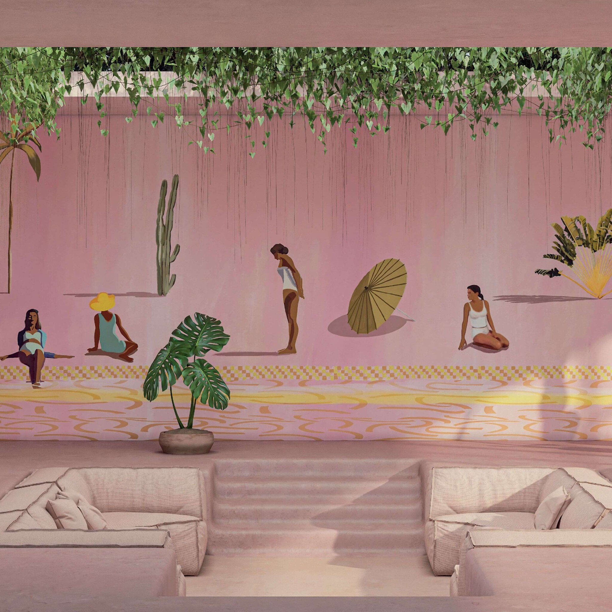 Panorama-Venus van Elitis. Dit panoramabehang uit de 360 collectie toont een uitzicht langs een uitgestrekt strand. Een roze landschap vol karakters.