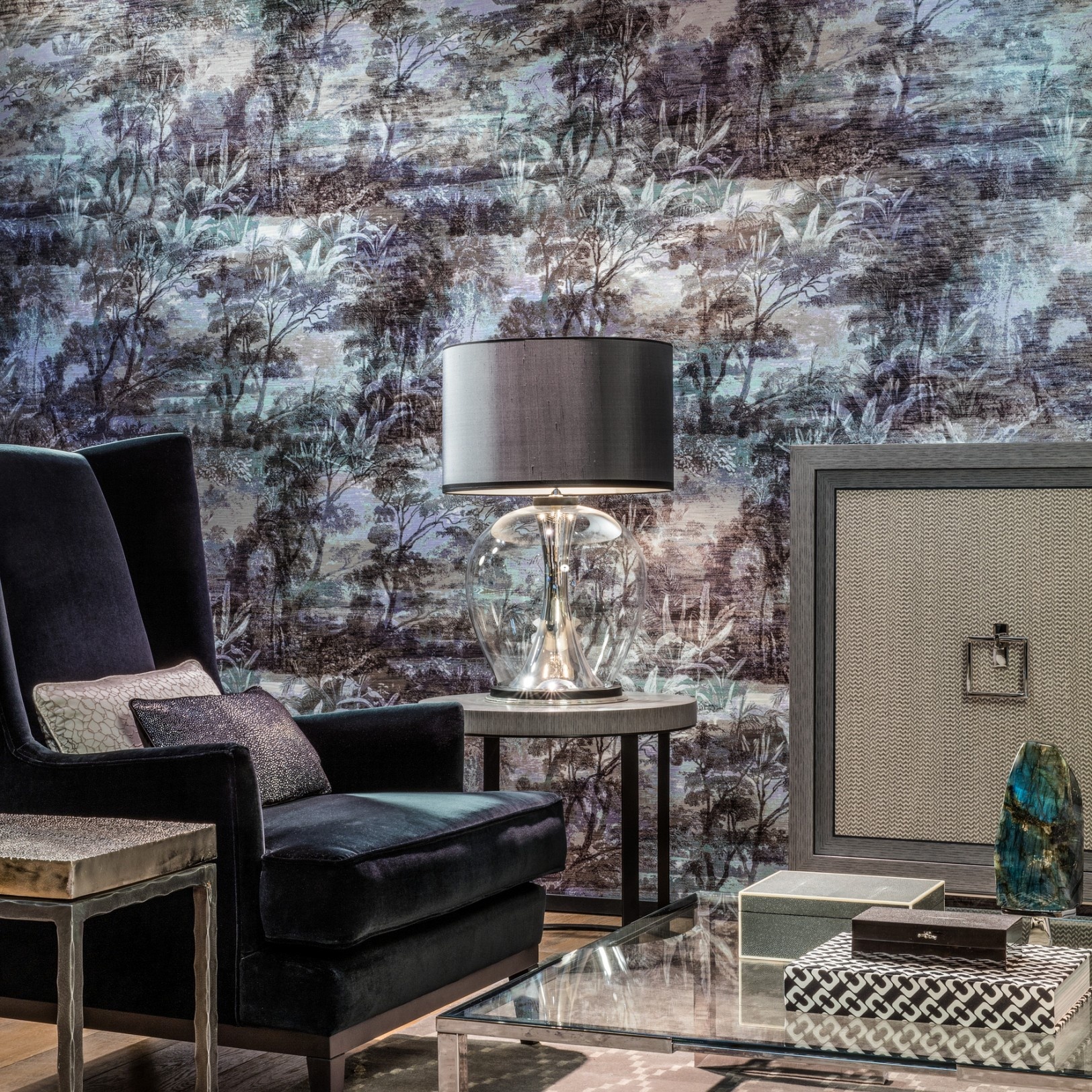 Een zwoel, warm oerwoud, verborgen in nevelen. Omgeven door kleuren en tropische dieren is het makkelijk wegdromen. Glade brengt de jungle bij je thuis met een mysterieuze woudtekening op een voelbare, geweven structuur.
