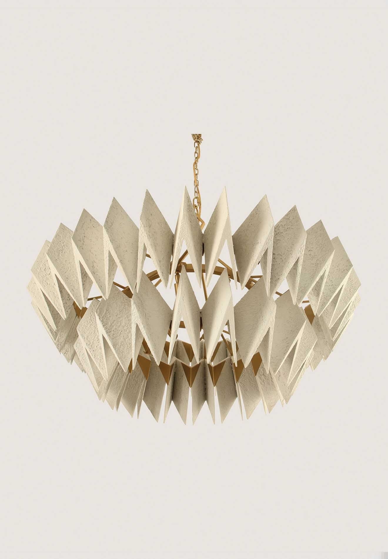 De Axel Kroonluchter bestaat uit twee lagen met origami-achtige vouwen. Geïnspireerd door brutalistische architectuur, creëert dit imposante stuk magische schaduwen. Het robuuste, witte oppervlak met kuiltjes wordt gecombineerd met de gladde, matte archit