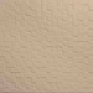 Adobe speelt met verschillende reliëfs, zowel in de hoogte als in de diepte. De onregelmatige vierkantjes en driehoeken creëren een speels, geometrisch en intrigerend effect.