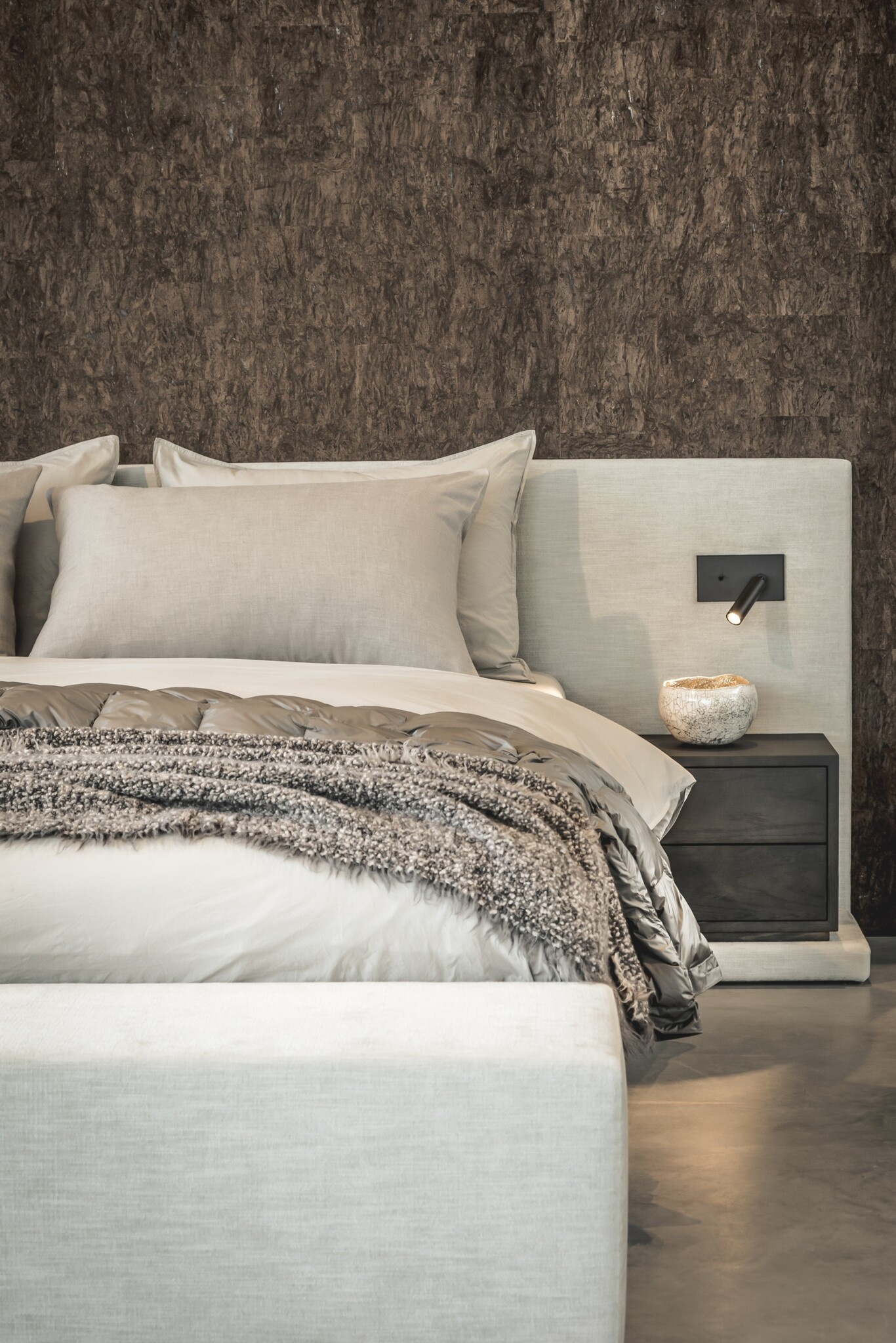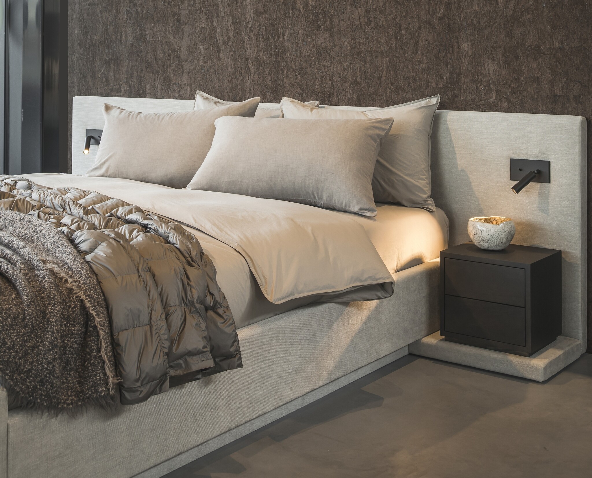 Italiaanse elegantie met strakke lijnen. De lage bedomranding en het brede, slanke hoofdbord vormen een perfect geheel. De extra brede geïntegreerde bedbank aan het voeteneinde biedt optimaal comfort en gemak.