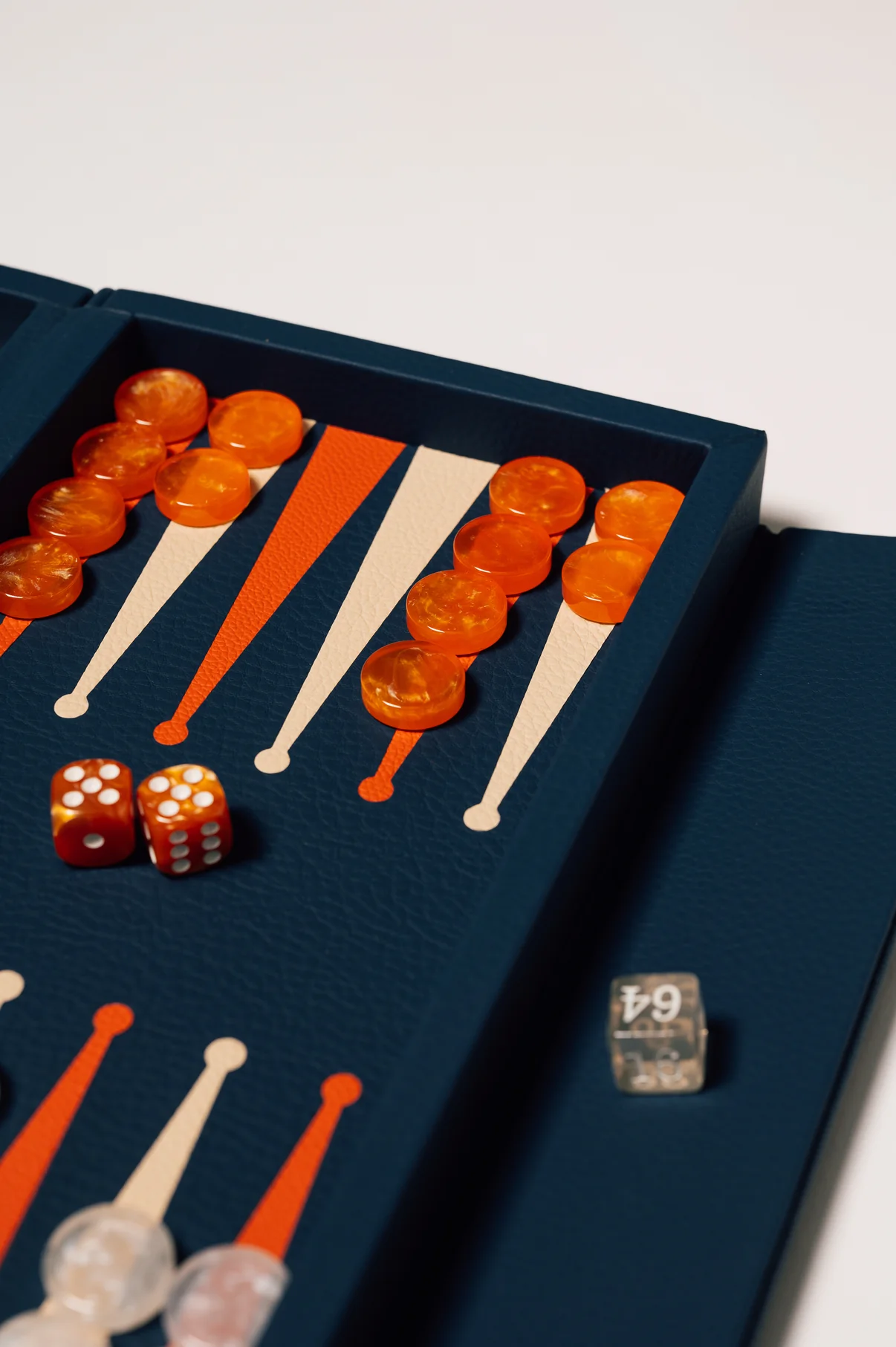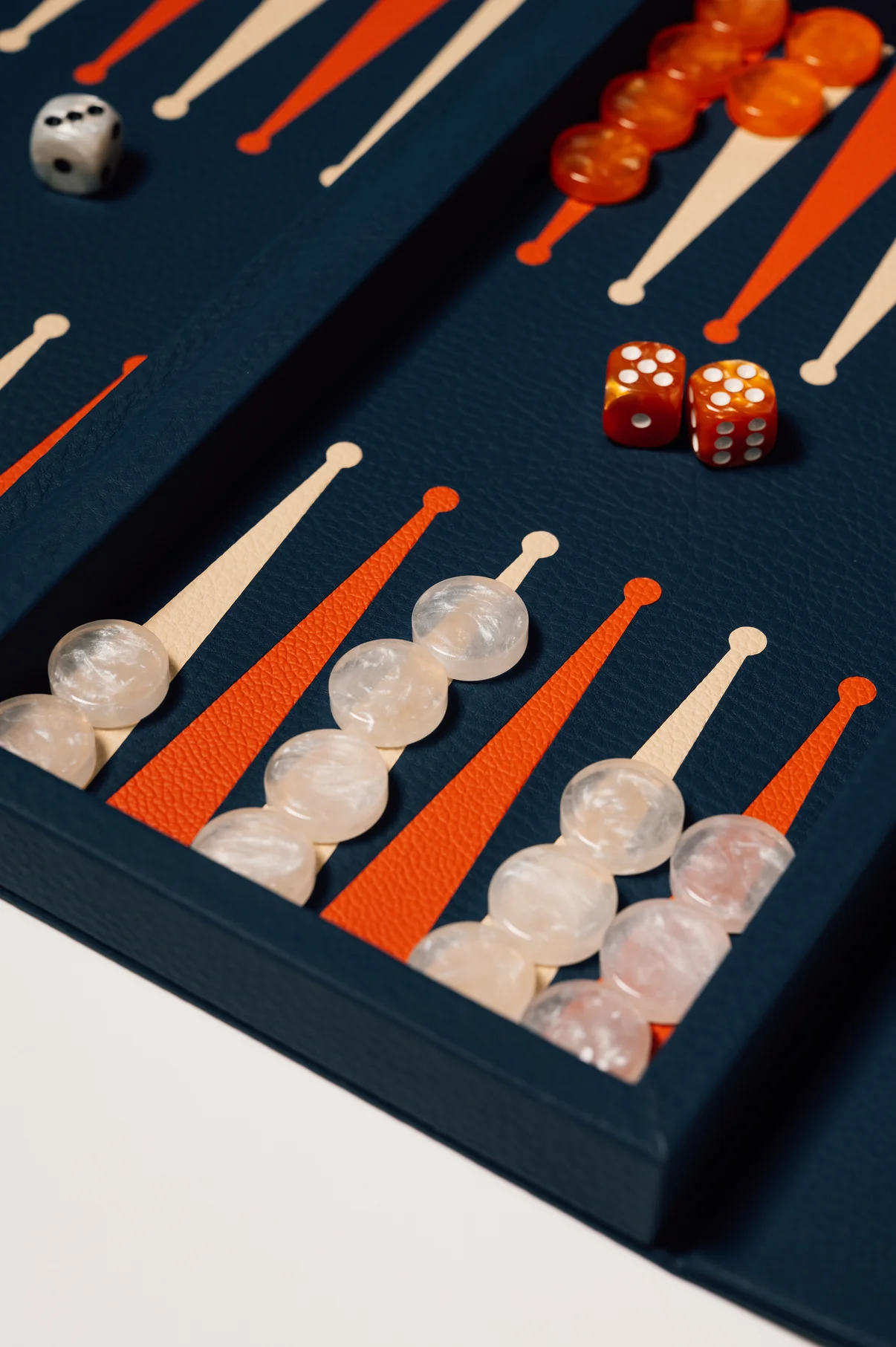 De diepe blauwe kleur straalt rust en zelfvertrouwen uit. Zowel de buitenzijde als de interieurdriehoeken zijn vervaardigd uit echt leer met natuurlijke nerf. De hoogwaardige resin speelstenen voelen solide en perfect gebalanceerd aan. Dankzij de naadloze magnetische sluiting sluit het booklet strak en elegant — als een luxe accessoire in plaats van een traditioneel spelbord.