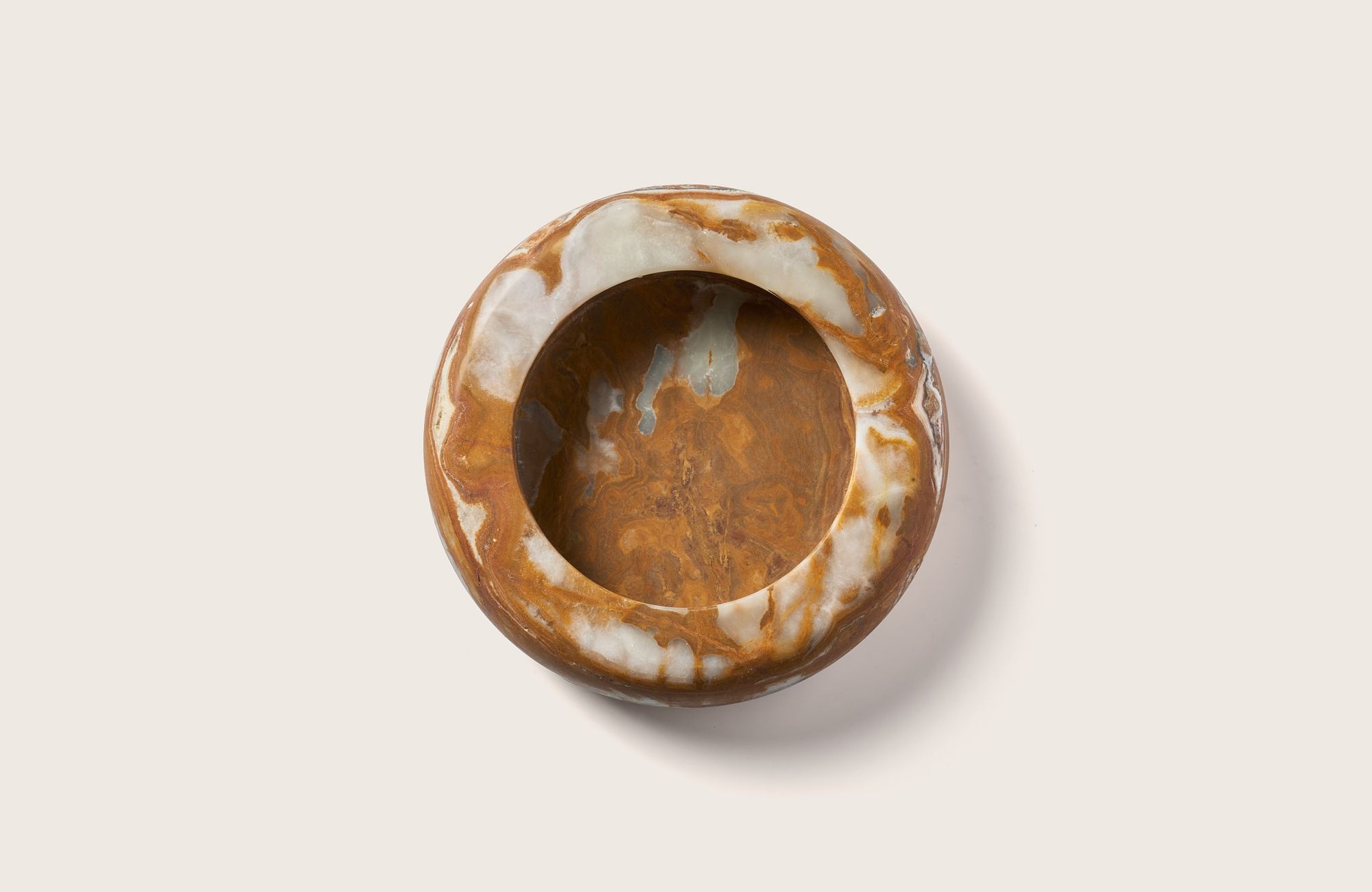 De Zaconi Bowl Beignet Desert Rose van onyx combineert warme roze tinten met natuurlijke elegantie. Een sculpturale schaal die direct luxe en charme toevoegt aan je interieur.