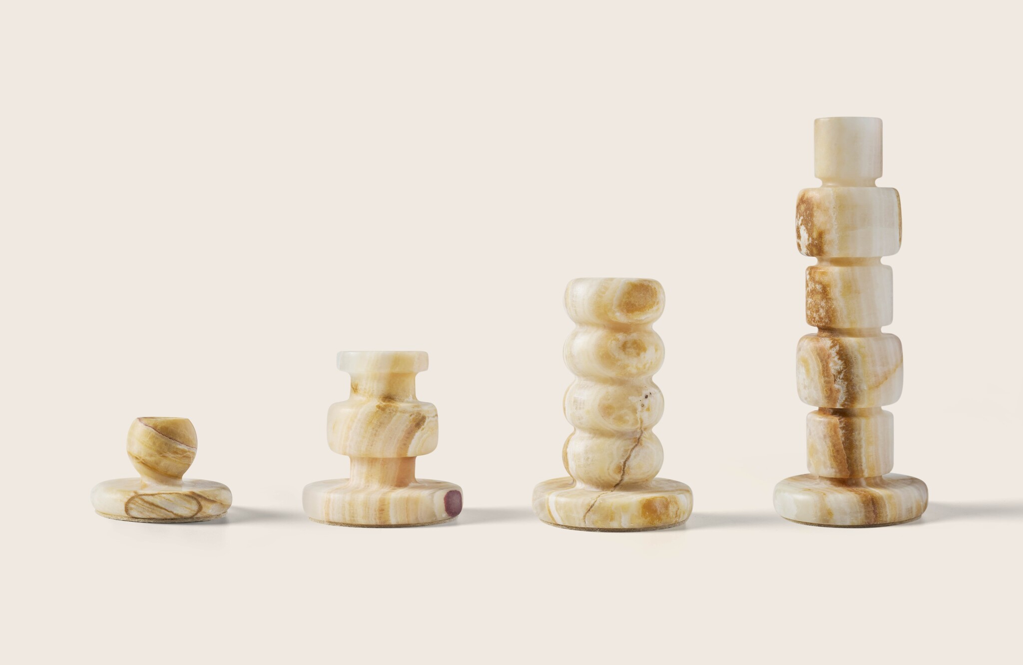Elke candle holder is uniek. De lichte, warme patronen in het onyx creëren een subtiel spel van licht dat je woonkamer, slaapkamer of badkamer direct verrijkt. De Sunrise tint straalt puurheid en zachtheid uit, waardoor elke setting een serene, luxueuze uitstraling krijgt.