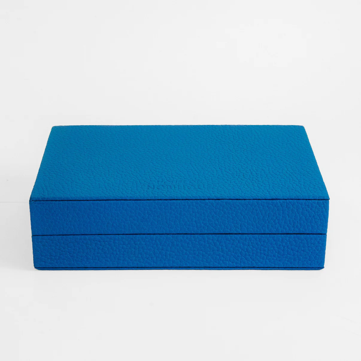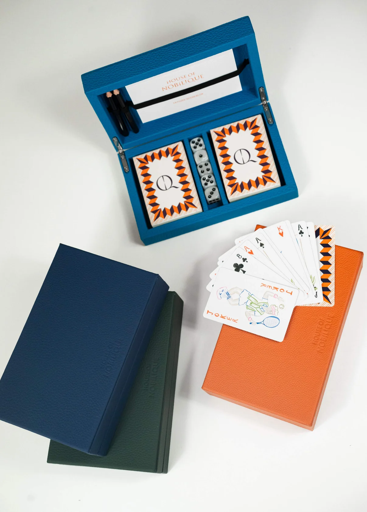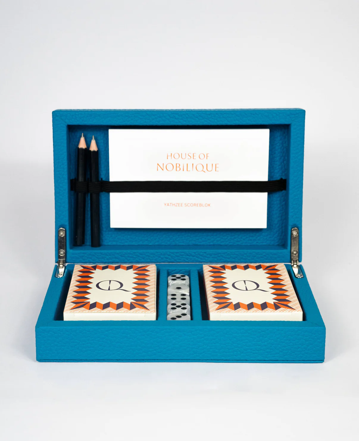 Til je spelervaring naar een hoger niveau met de Card Box Azure Blue – een luxe, handgemaakte lederen box voor echte spelletjesliefhebbers. Elk setje bevat speelkaarten, dobbelstenen en een Yahtzee-notitieboek, prachtig verpakt met een elegante magnetische sluiting.