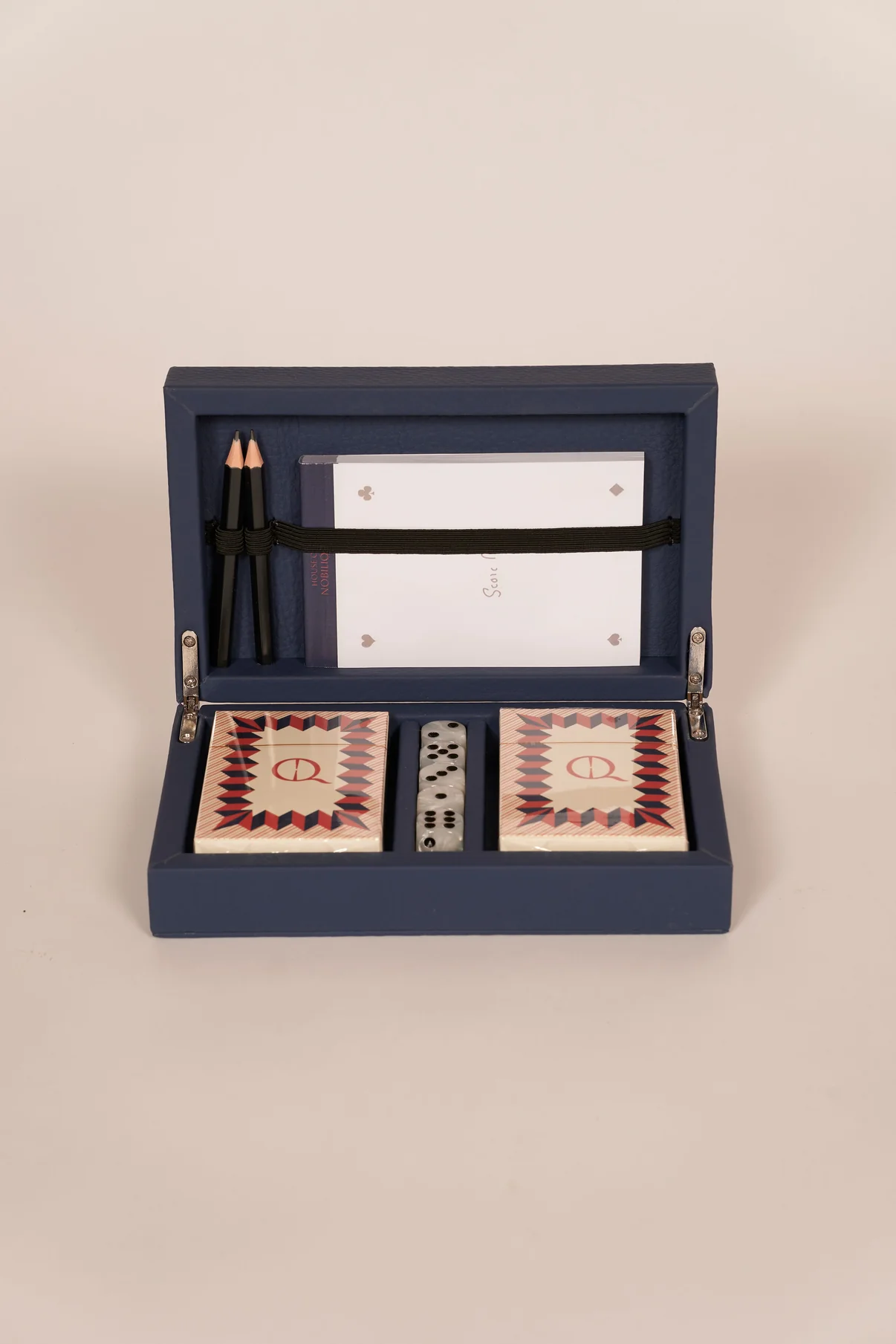 Sommige momenten verdienen meer dan een simpel spelletje. Met de Card Box Deep Blue maak jij van elk spel een stijlvolle ervaring. Deze luxe, handgemaakte lederen box bevat speelkaarten, dobbelstenen en een Yahtzee-notitieboek – elegant samengebracht in een compact ontwerp met magnetische sluiting.