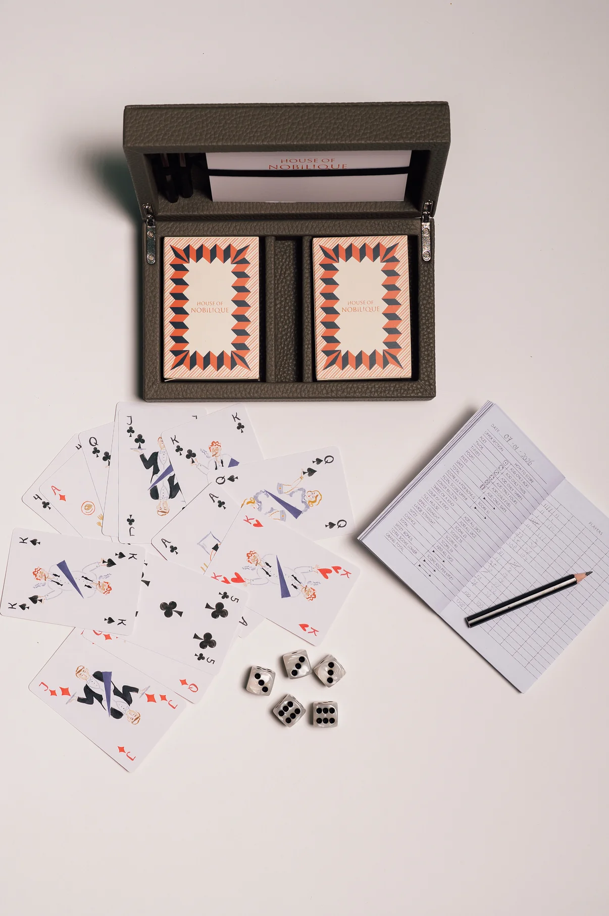 Ontdek het ultieme spelervaring met de Card Box Taupe – een luxe, handgemaakte lederen box voor de echte spelletjesliefhebber. Elke box bevat speelkaarten, dobbelstenen en een Yahtzee-notitieboek, alles verpakt in een elegant ontwerp met een magnetische sluiting.