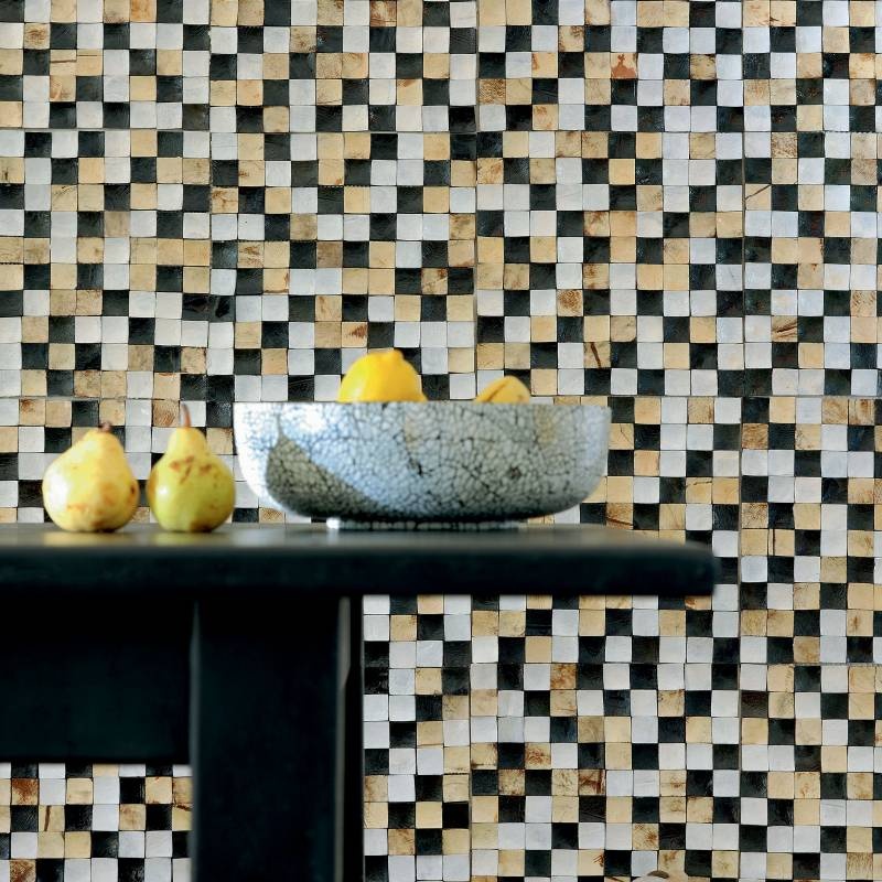 Elitis Cocoschelpenbehang is een unieke collectie wandbekleding, ideaal voor statement- of feature-wanden in een residentiële of commerciële omgeving. Elitis neemt de schillen van kokosnoten en transformeert deze tot ambachtelijke muurbekleding.