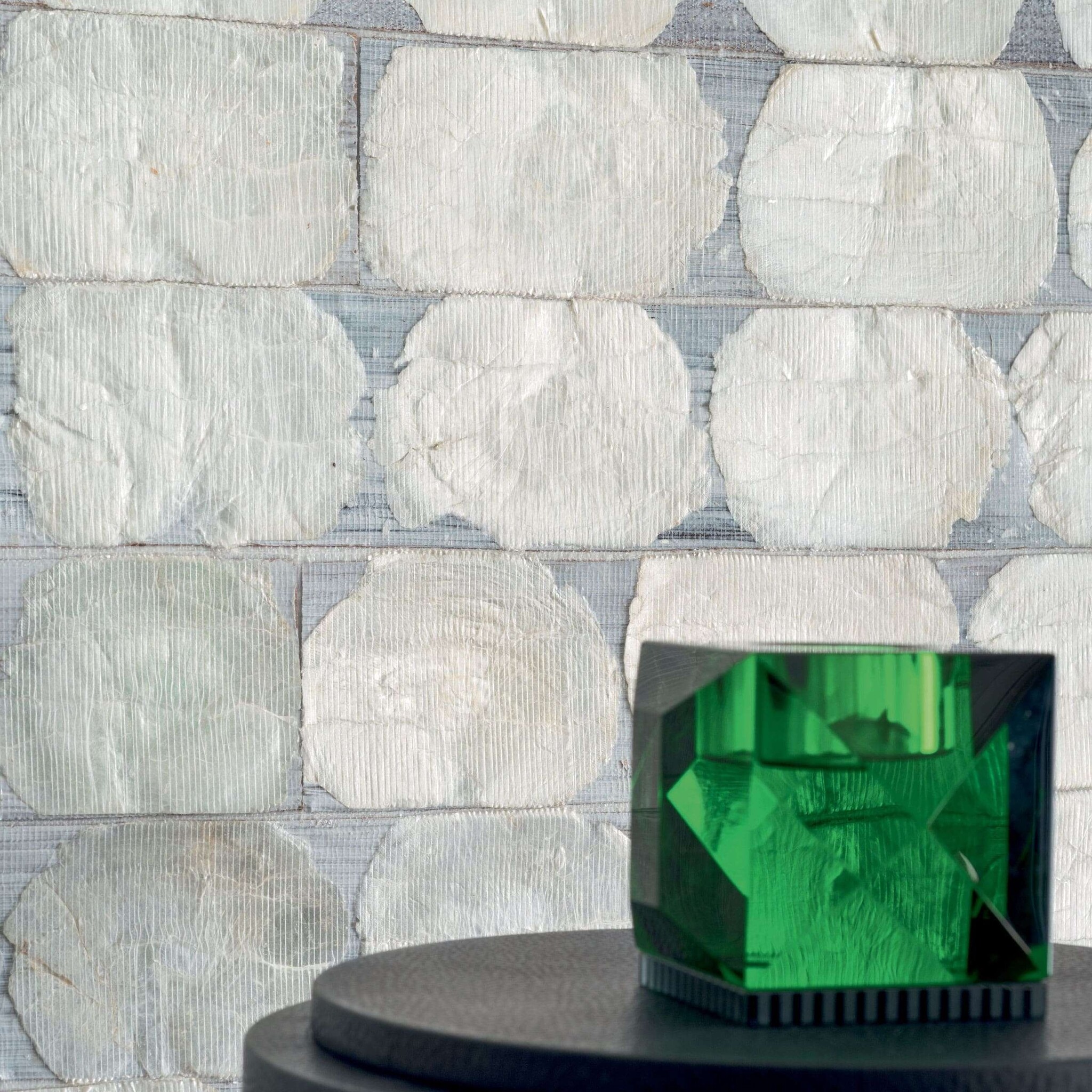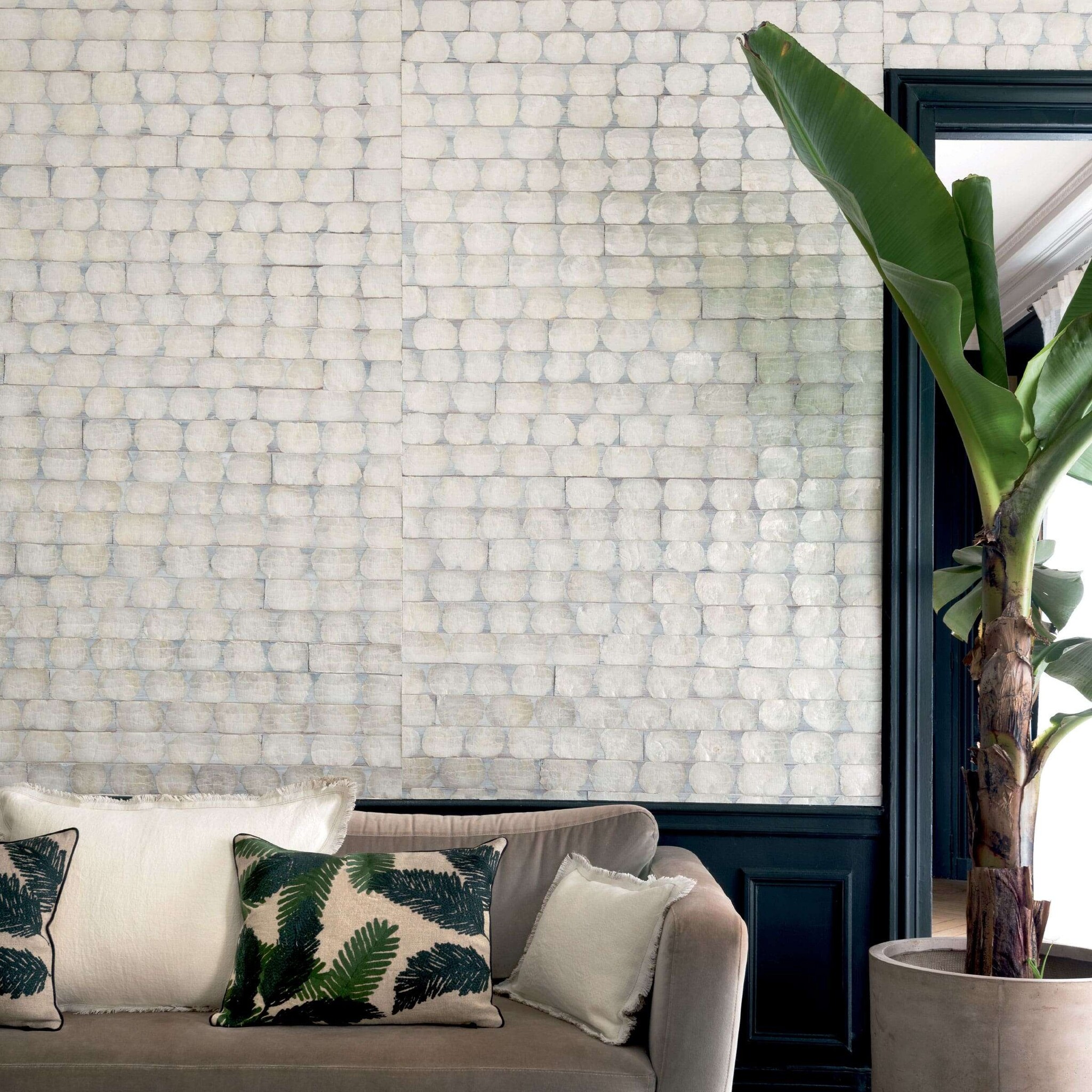 Elitis Puerto Princesa behang is gemaakt van schelpen en vezels. Op het behang zijn parelmoerkleurige schelpen afgebeeld, in horizontale lijnen geplaatst. Het behang is handgemaakt van natuurlijke materialen en alleen al daarom al een lust voor het oog.