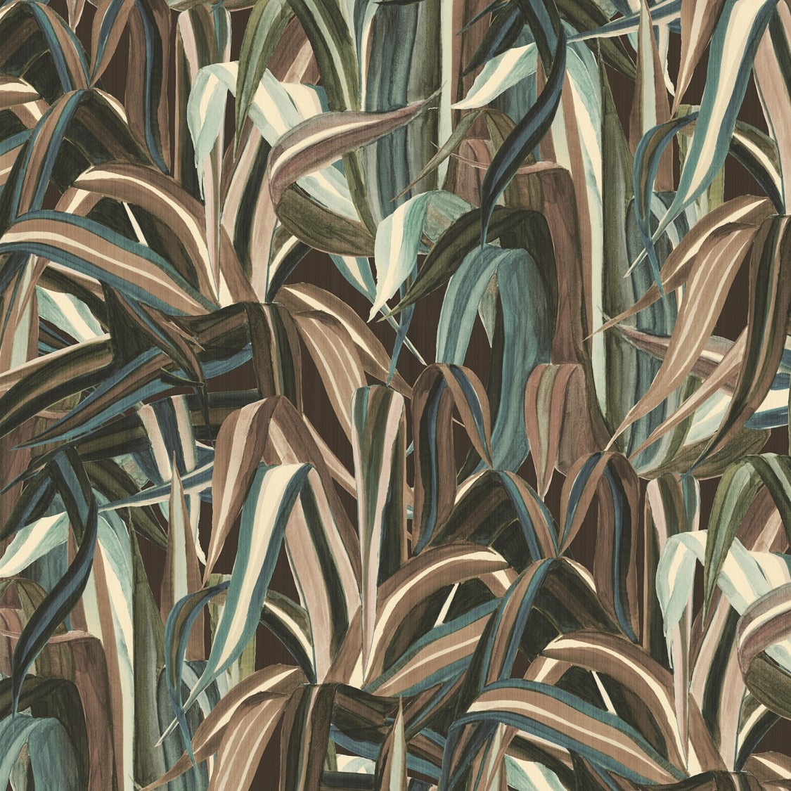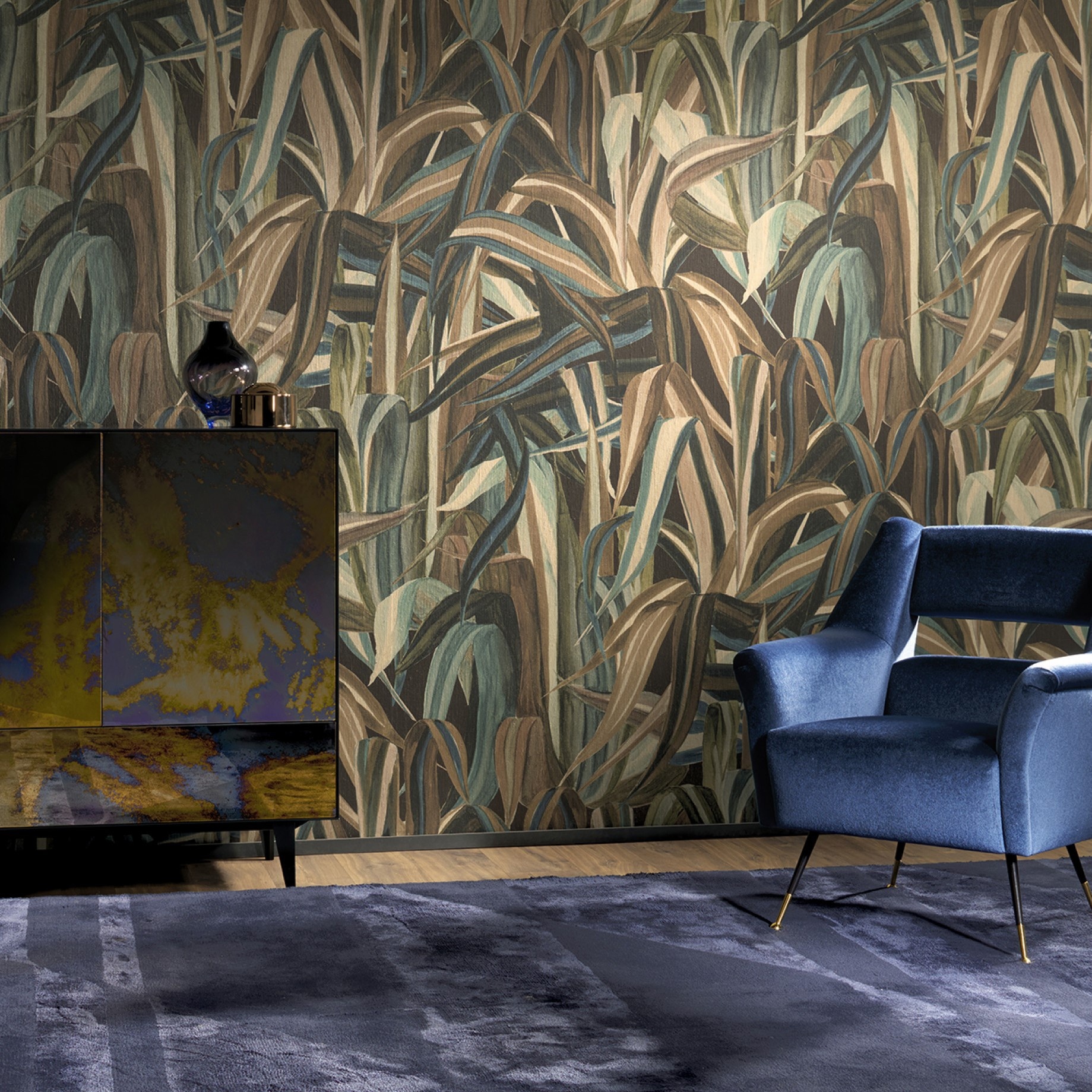 Een uitbundig botanisch design van tropische bladeren met het gevoel van een handgeschilderde muurbekleding. Gedrukt in levendige kleuren op een fil-a-fil van jutedraden. Deze geven een ongekende diepte en bijzonder natuurlijk aspect aan de muur.