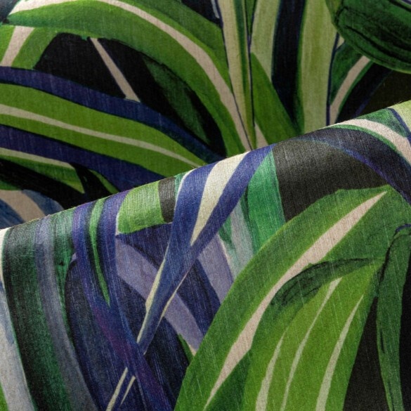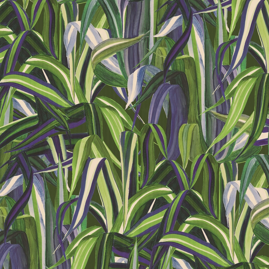 Een uitbundig botanisch design van tropische bladeren met het gevoel van een handgeschilderde muurbekleding. Gedrukt in levendige kleuren op een fil-a-fil van jutedraden. Deze geven een ongekende diepte en bijzonder natuurlijk aspect aan de muur.