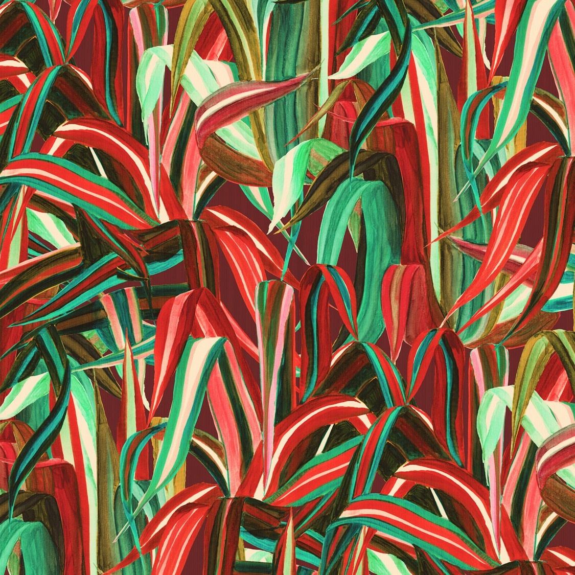 Een uitbundig botanisch design van tropische bladeren met het gevoel van een handgeschilderde muurbekleding. Gedrukt in levendige kleuren op een fil-a-fil van jutedraden. Deze geven een ongekende diepte en bijzonder natuurlijk aspect aan de muur.