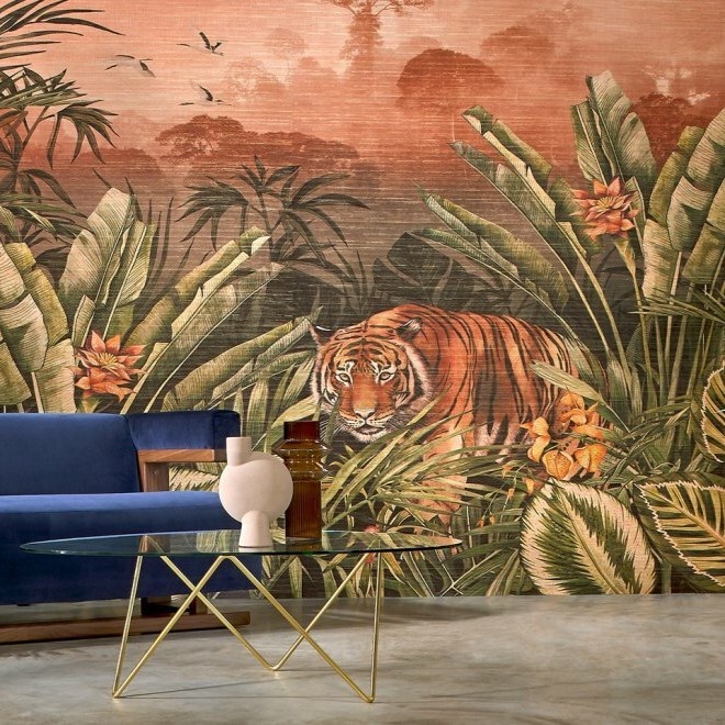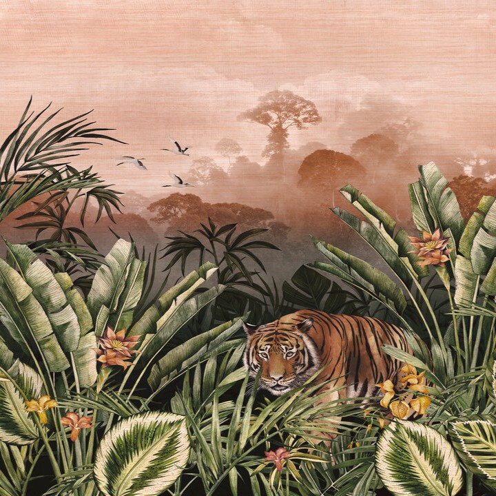 ARTE Silk Road Garden behang tovert uw muren om tot een levensechte jungle scenery en vormt de eyecatcher. Een Bengaalse tijger sluipt behoedzaam dichterbij uit het woud, je ziet de levensechte vegetatie en hoort de roep van exotische vogels!