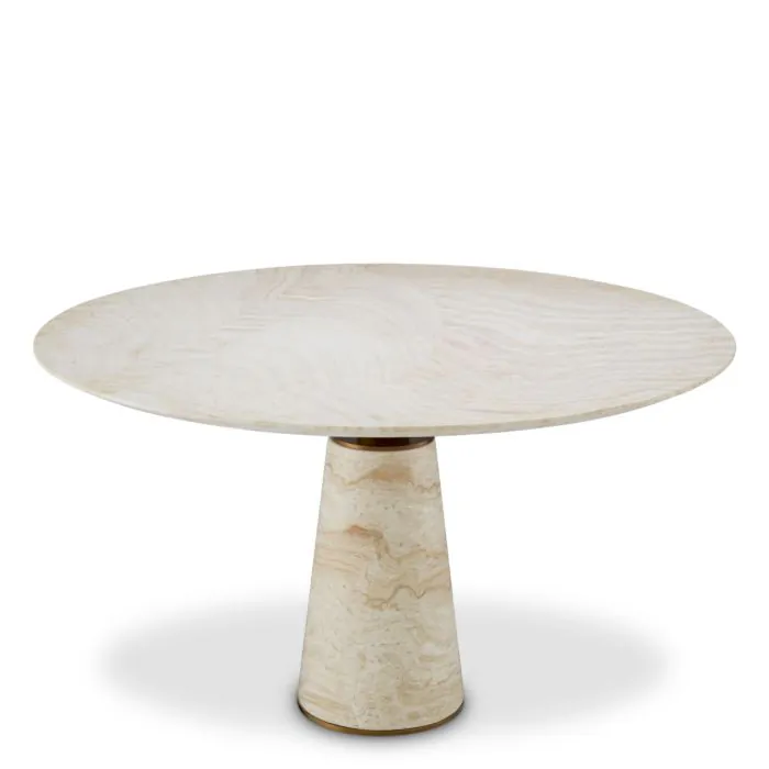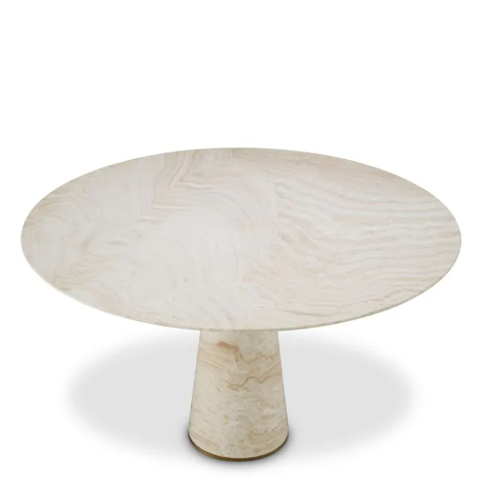 De Genova Dining Table combineert een luxe travertin blad met een brushed brass onderstel. Een tijdloze eettafel die natuurlijke elegantie en moderne verfijning samenbrengt.