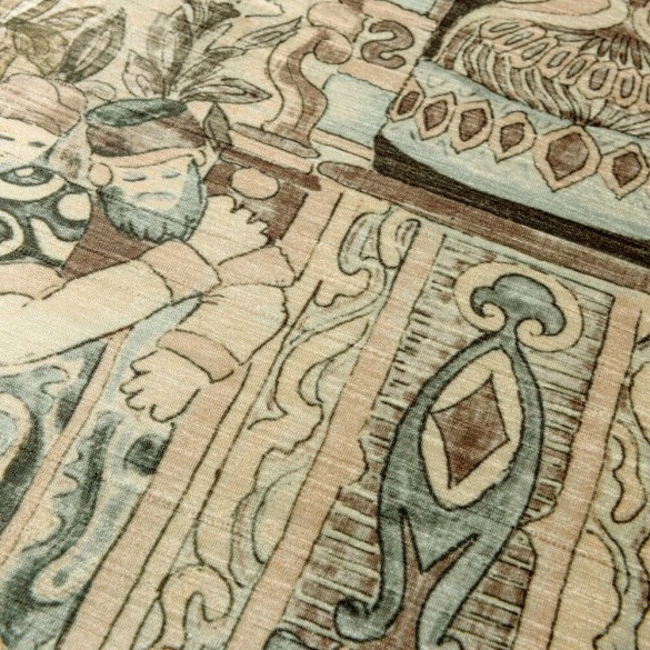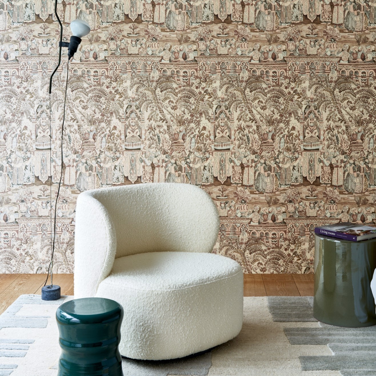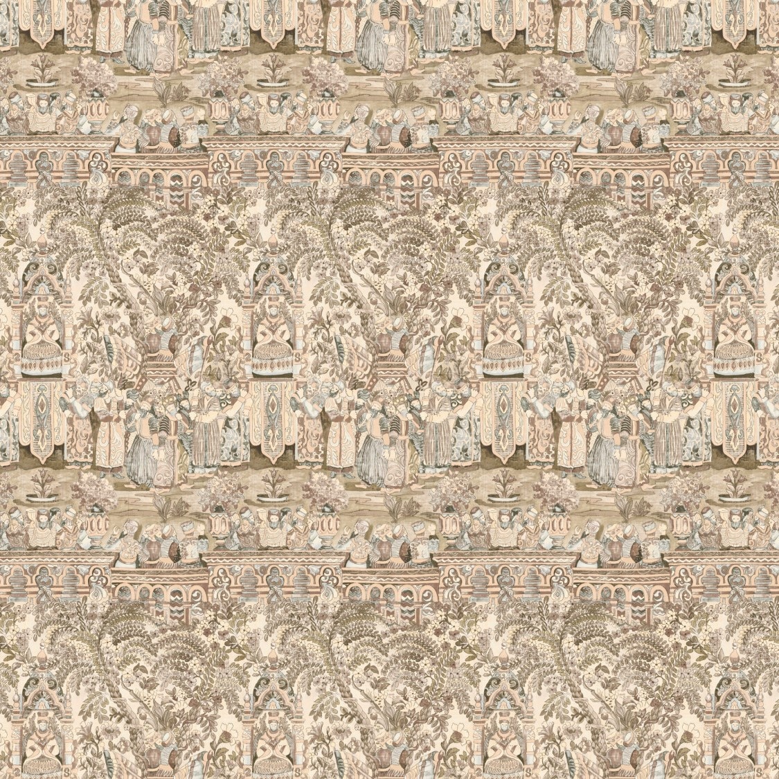 Dit kleurrijk patroon gebaseerd op een handschilderij illustreert een vrolijk tafereel uit het Ottomaanse rijk. Er valt eindeloos veel te ontdekken. De muurbekleding imiteert erg fijne zijde. Een waar statement piece!