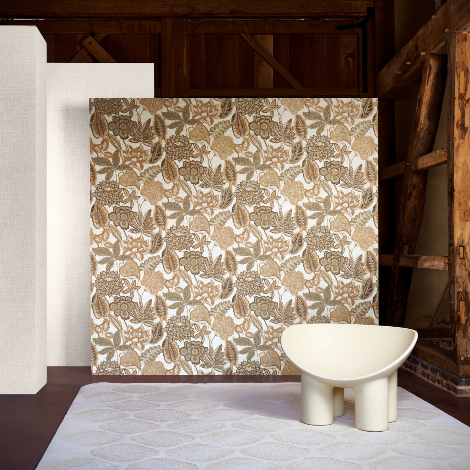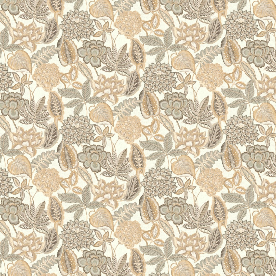 Dit verfijnd patroon toont een gedetailleerde, florale print. Het haalt haar inspiratie uit vintage stoffen, welke een rijkelijk gevoel geven. Deze frivole tekening komt tot haar recht door het linneneffect en subtiel metaalaccent.