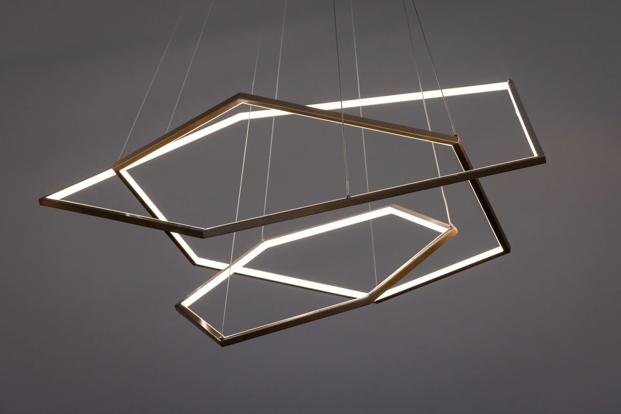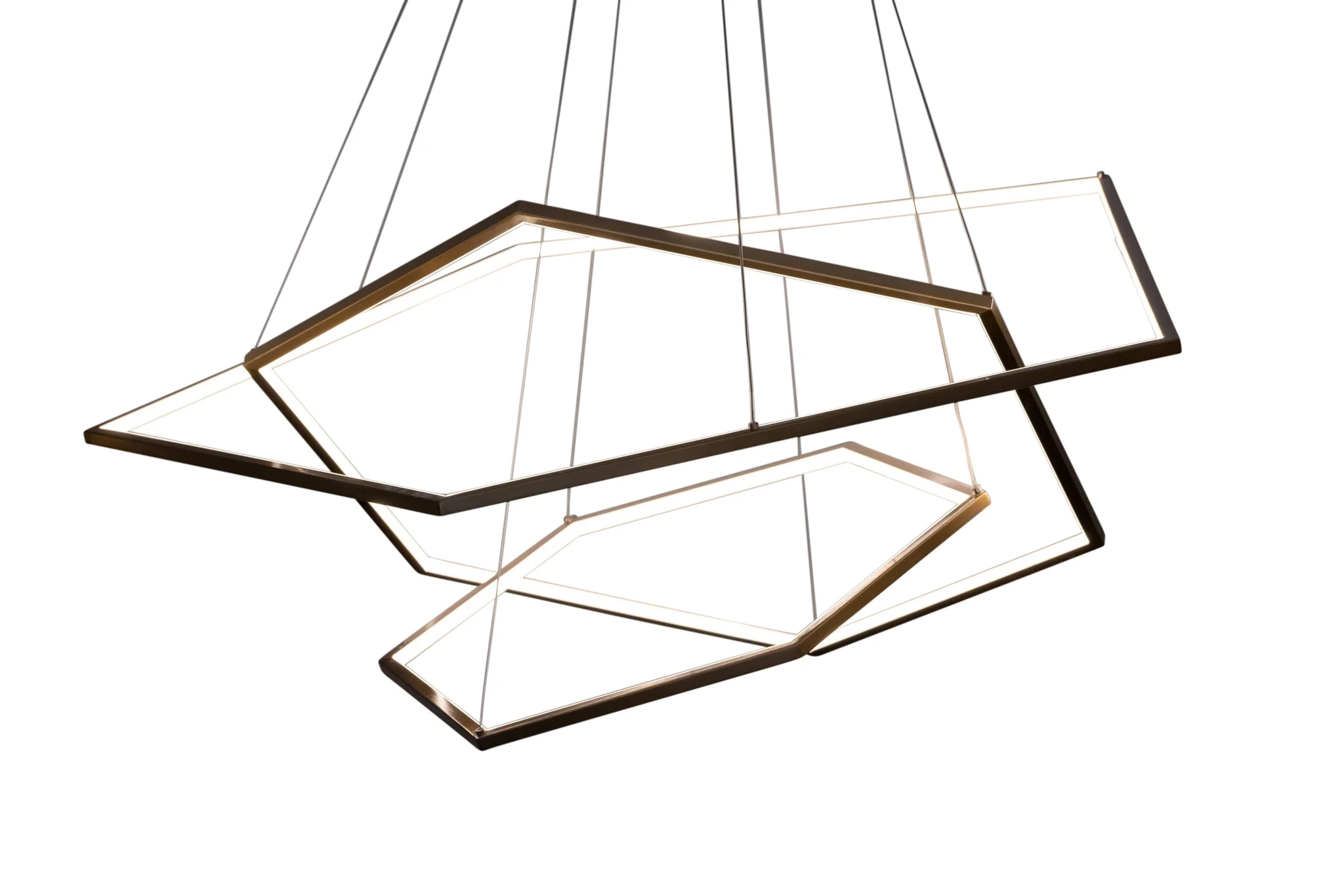 Moderne kroonluchter met drie hexagonale cirkels die elegant in elkaar passen. Strak design met een tijdloze twist.