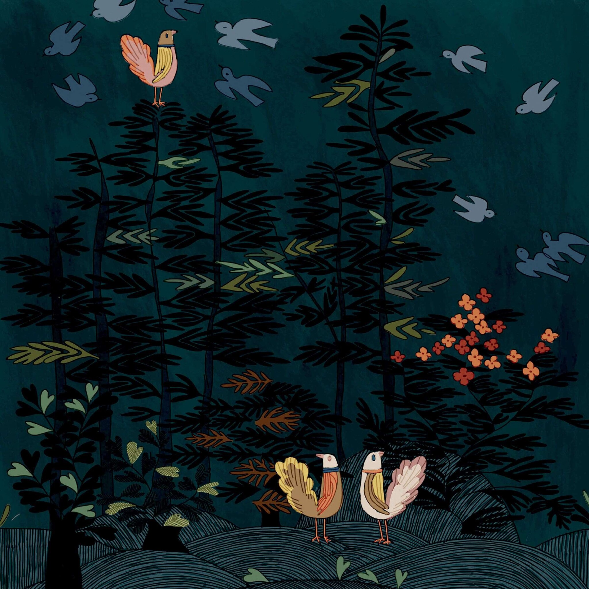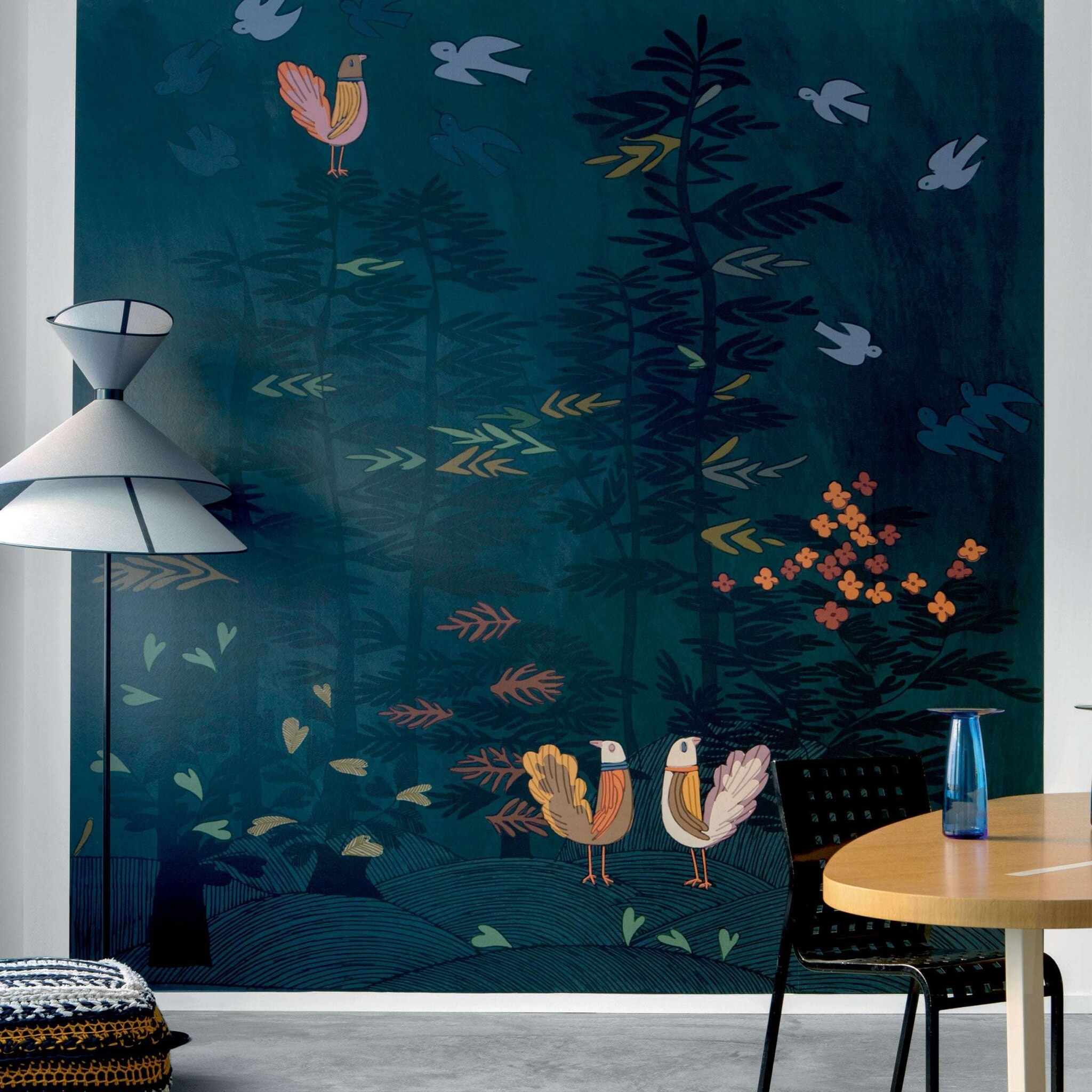 ELITIS Jardin Imaginaire Paneelbehang illustreert een scene uit een magisch bos. De kleurrijke, sierlijke bladeren, bloemen en vogels springen uit de donkere mysterieuze achtergrond waarin uitgestrekte bomen zich bevinden. Mysterieus en kleurrijk geeft dit geillustreerde landschap sfeer aan de ruimte. Dit paneelbehang spreekt tot je verbeelding.