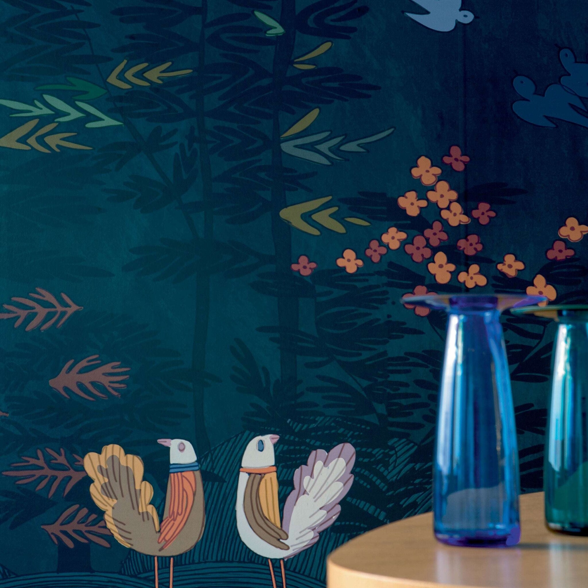 ELITIS Jardin Imaginaire Paneelbehang illustreert een scene uit een magisch bos. De kleurrijke, sierlijke bladeren, bloemen en vogels springen uit de donkere mysterieuze achtergrond waarin uitgestrekte bomen zich bevinden.