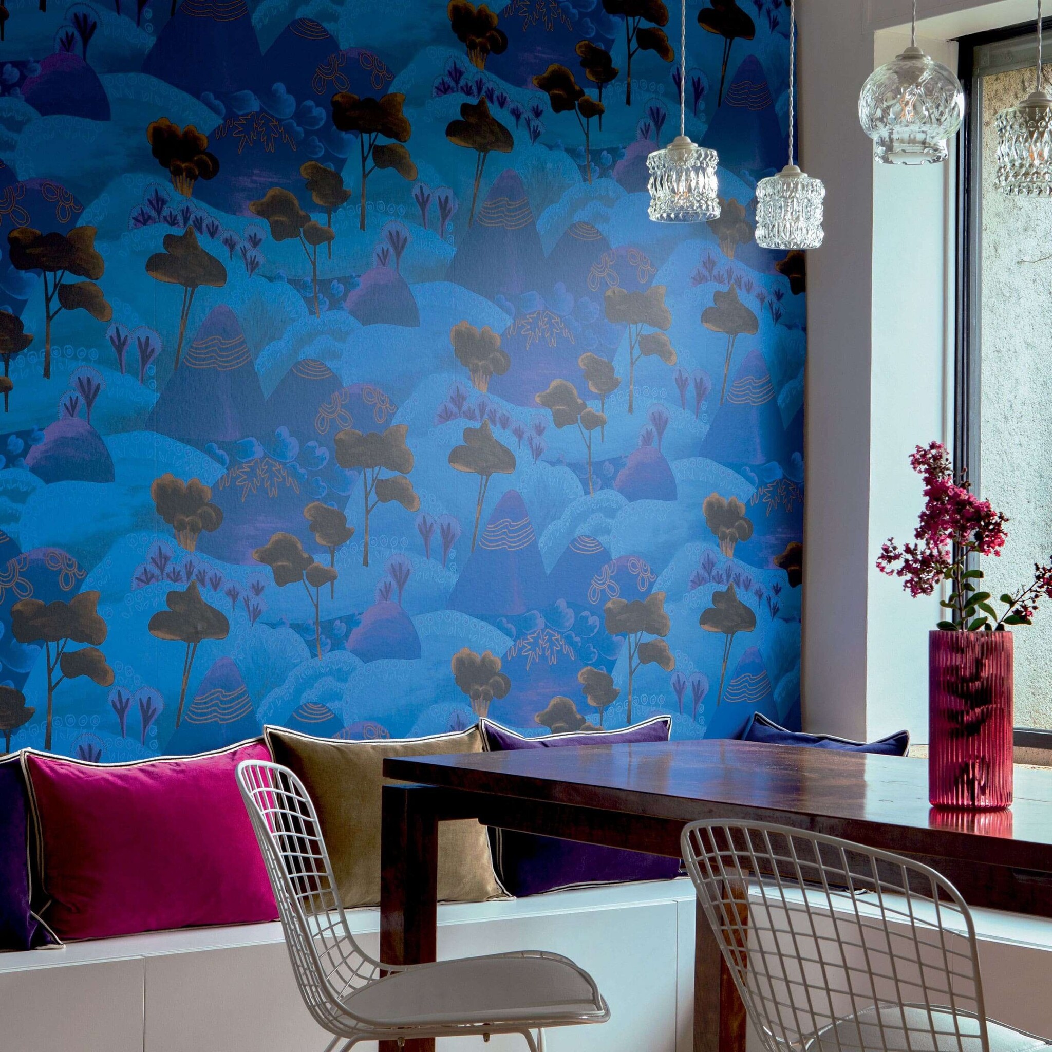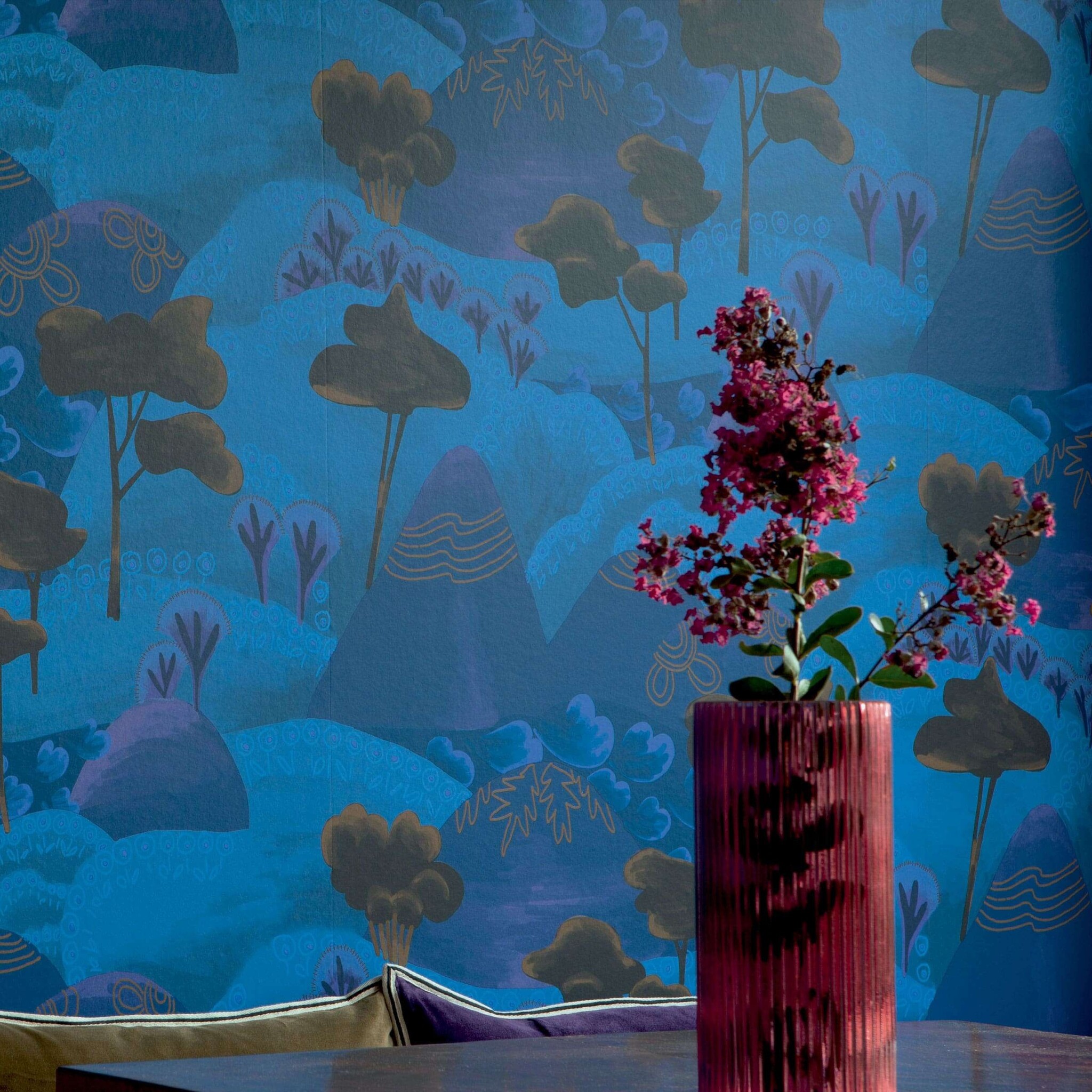 ELITIS Reves de Manille Behang toont een magisch berglandschap waarin sierlijke bomen en struiken worden omgeven door bergen waarvan de bergtoppen door verschillende patronen zijn versierd.