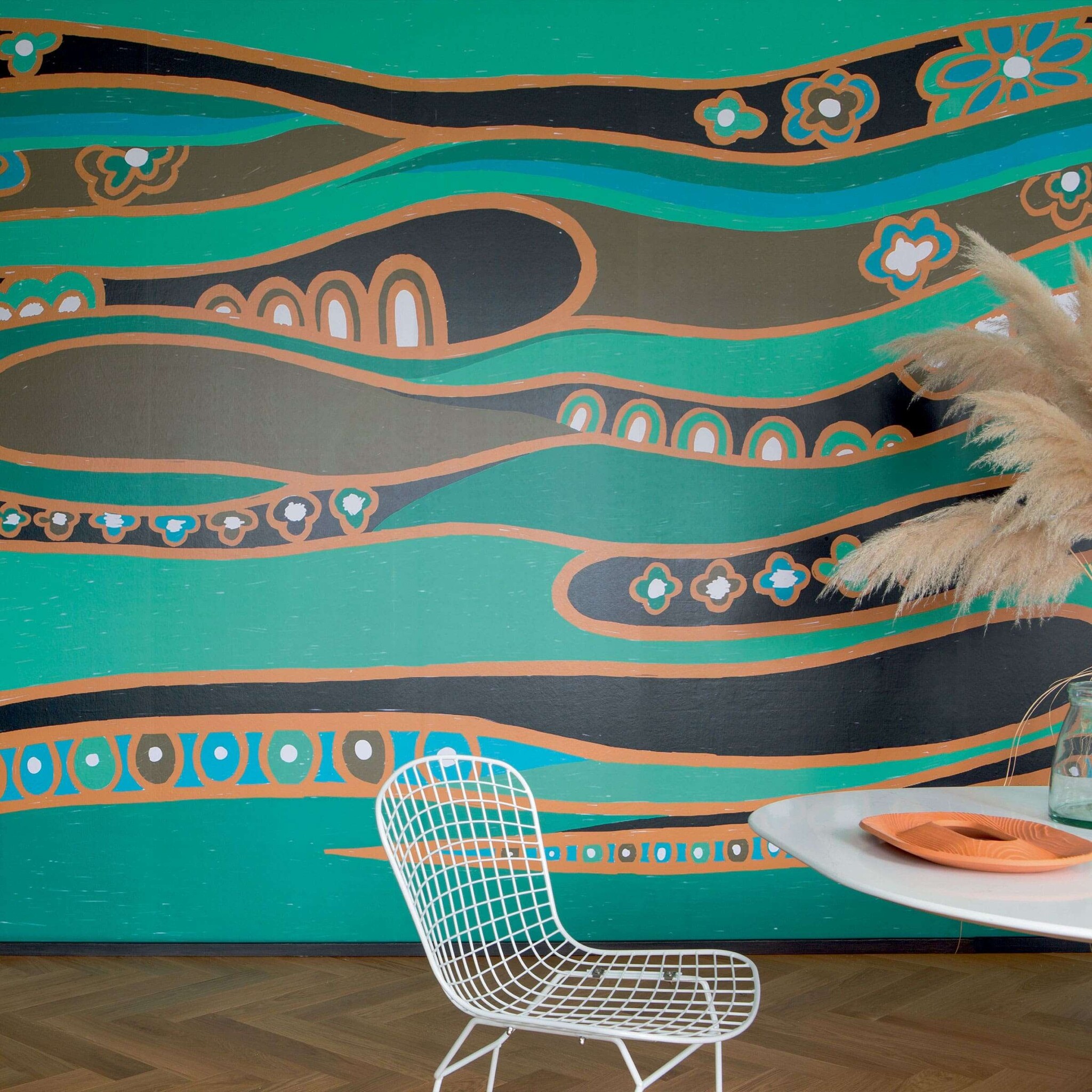 ELITIS Una Storia Paneelbehang is een grafisch, artistiek paneelbehang. Het behang lijkt te bewegen door de golvende lijnen die bergen of golven insinueren. De sierlijke, artistieke vormen in verschillende kleuren verrijken het behang.