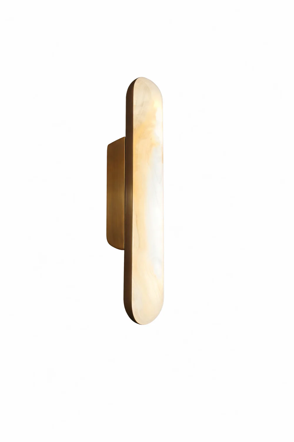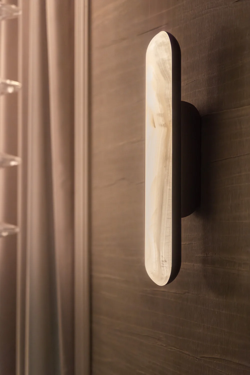 De ONICE Wandlamp combineert natuurlijke onyx met een warme bronzen afwerking. Het translucente steen zorgt voor een zachte, luxe gloed en maakt elke lamp uniek.