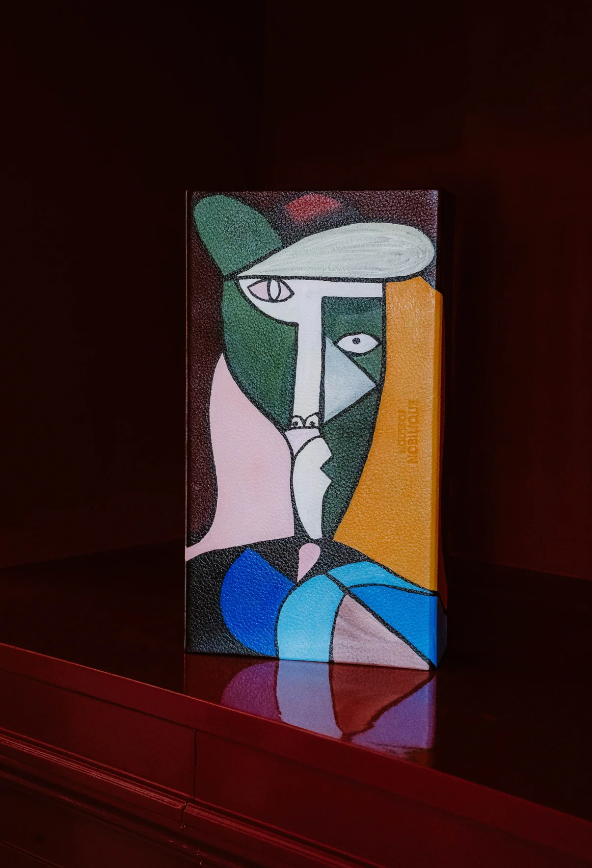 Kies jouw kleurcombinatie — Burgundy Multi Color, Orange of Burgundy met Bold Blue — en laat een ontwerp creëren dat jouw persoonlijkheid weerspiegelt. Het premium leren booklet wordt beschilderd met gespecialiseerde, duurzame pigmenten en vervolgens gesigneerd door de kunstenaar.