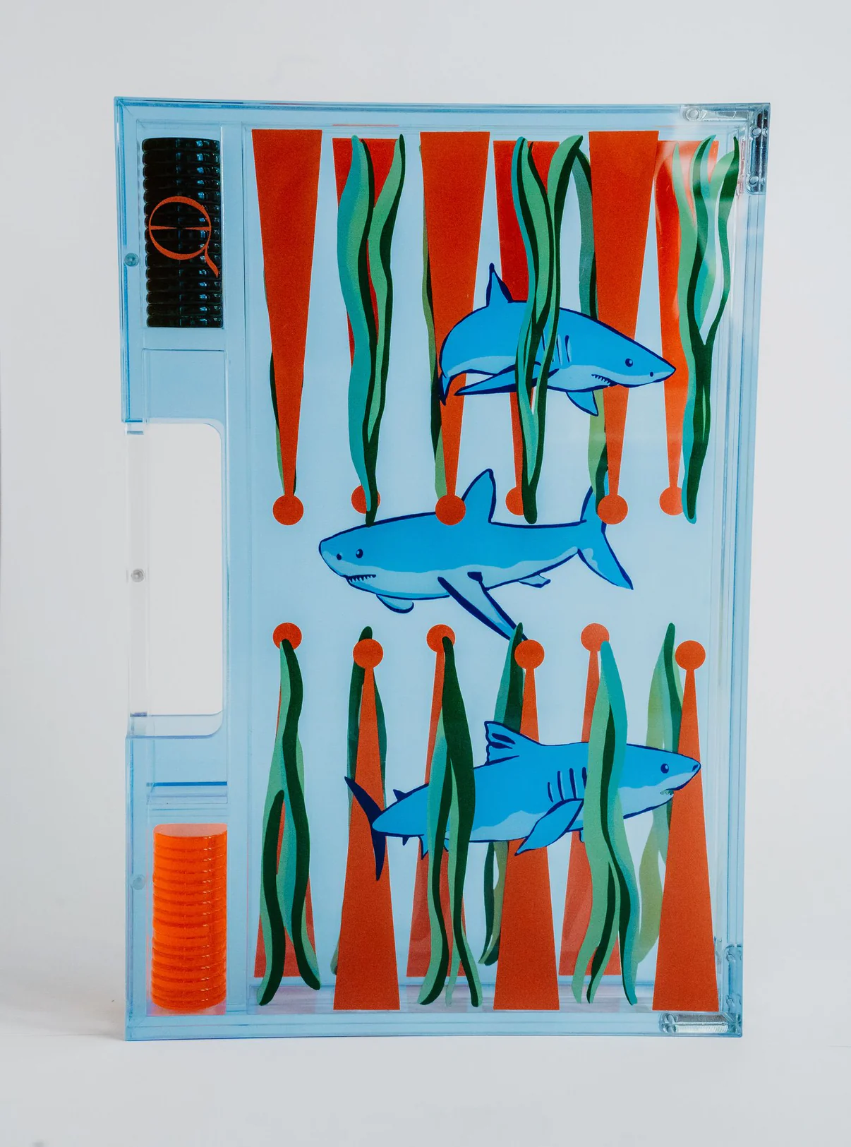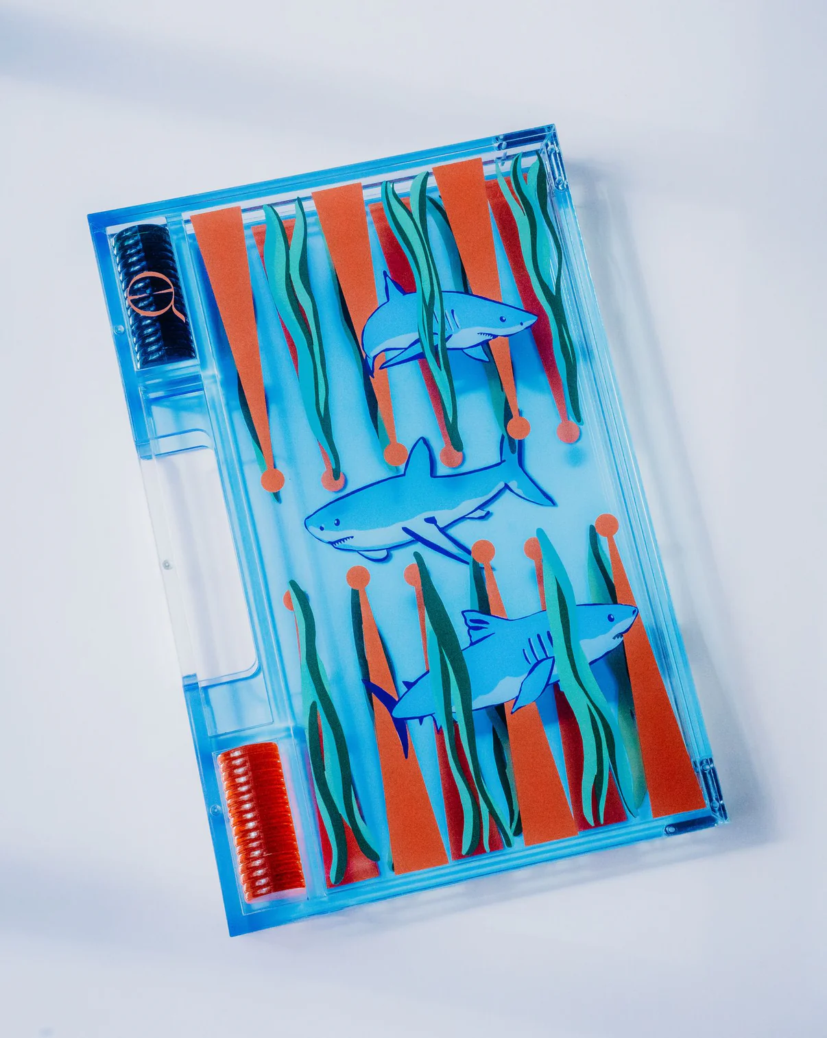 Speel overal in stijl met de Portable Shark Backgammon. Premium blauw acryl, uniek shark-design, magnetische sluiting en geïntegreerd handvat.