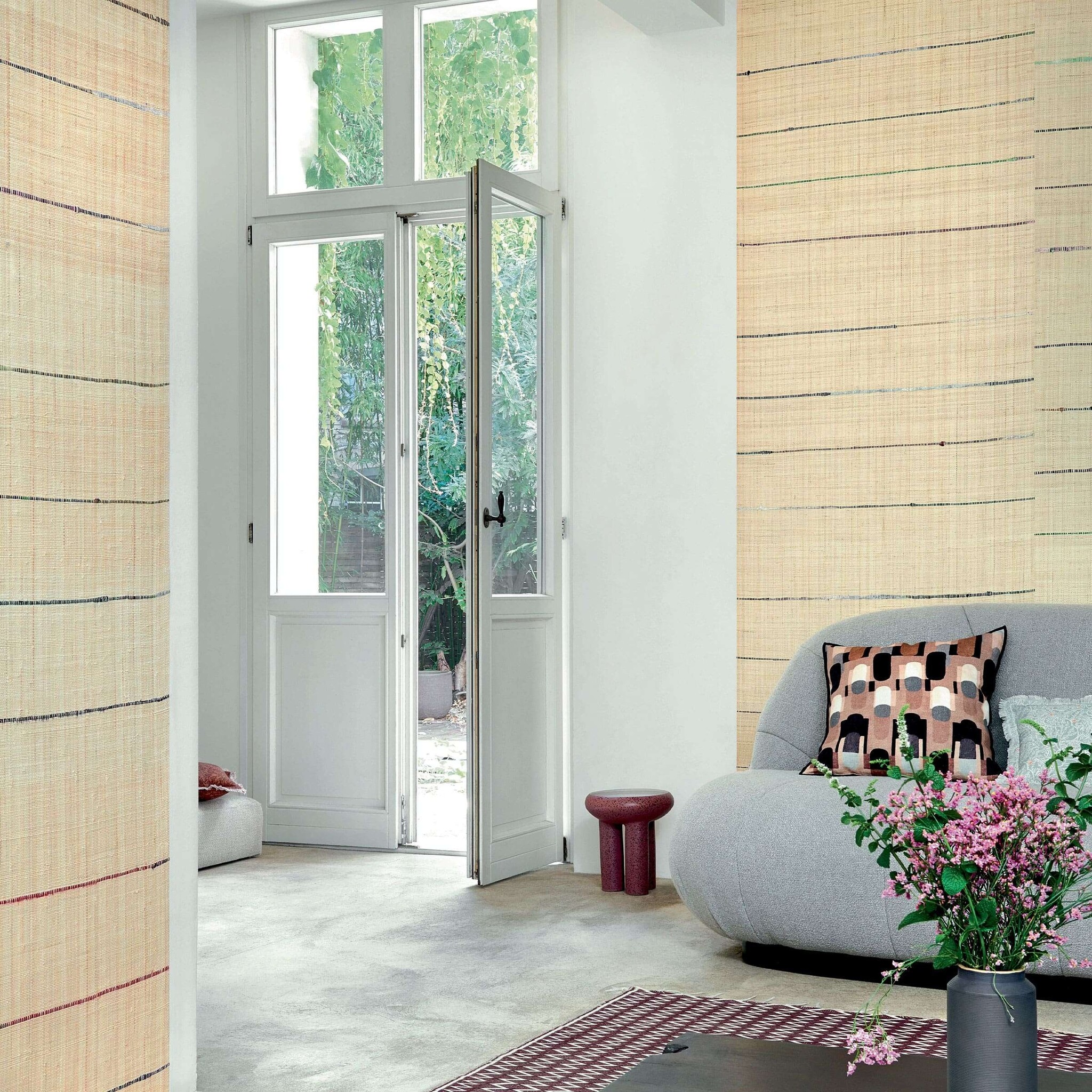 Elitis Tsarabanjina behang is een echte smaakmaker. Het behang is namelijk gemaakt van subtiel geweven raffia en afgewerkt met zijden lint.