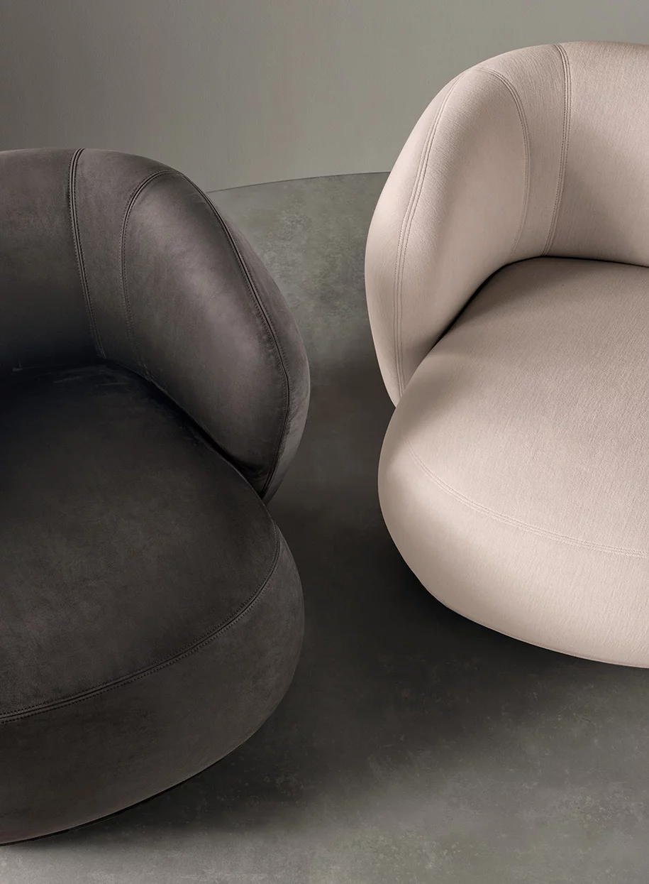 Met harmonieuze proporties en een omhullend design is deze fauteuil ideaal voor een gesprekshoek, een stijlvolle woonkamer of een serene slaapkamer. De bekleding, verkrijgbaar in zachte leersoorten en verfijnde stoffen, benadrukt de vloeiende rondingen en voegt een vleugje luxe toe.
