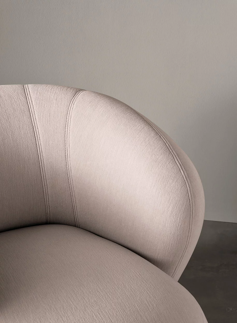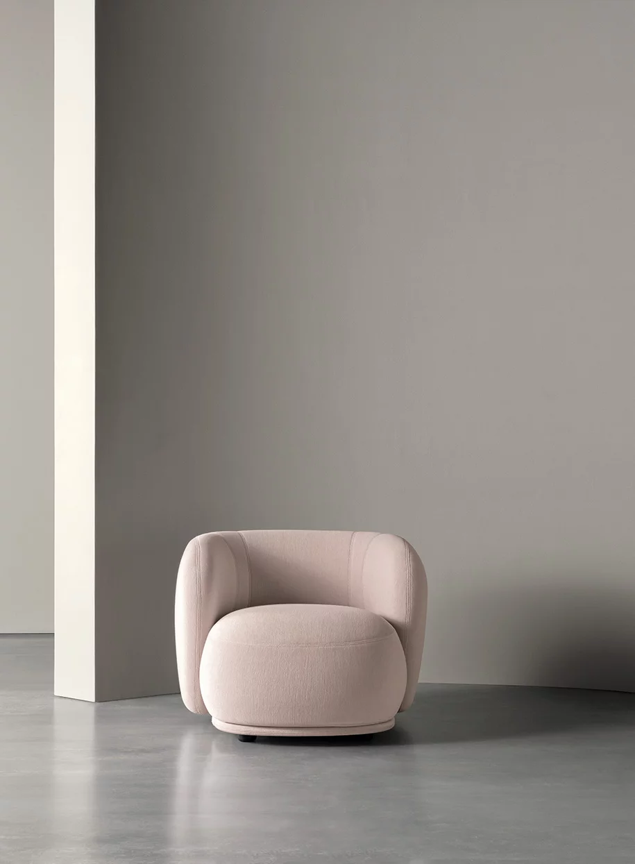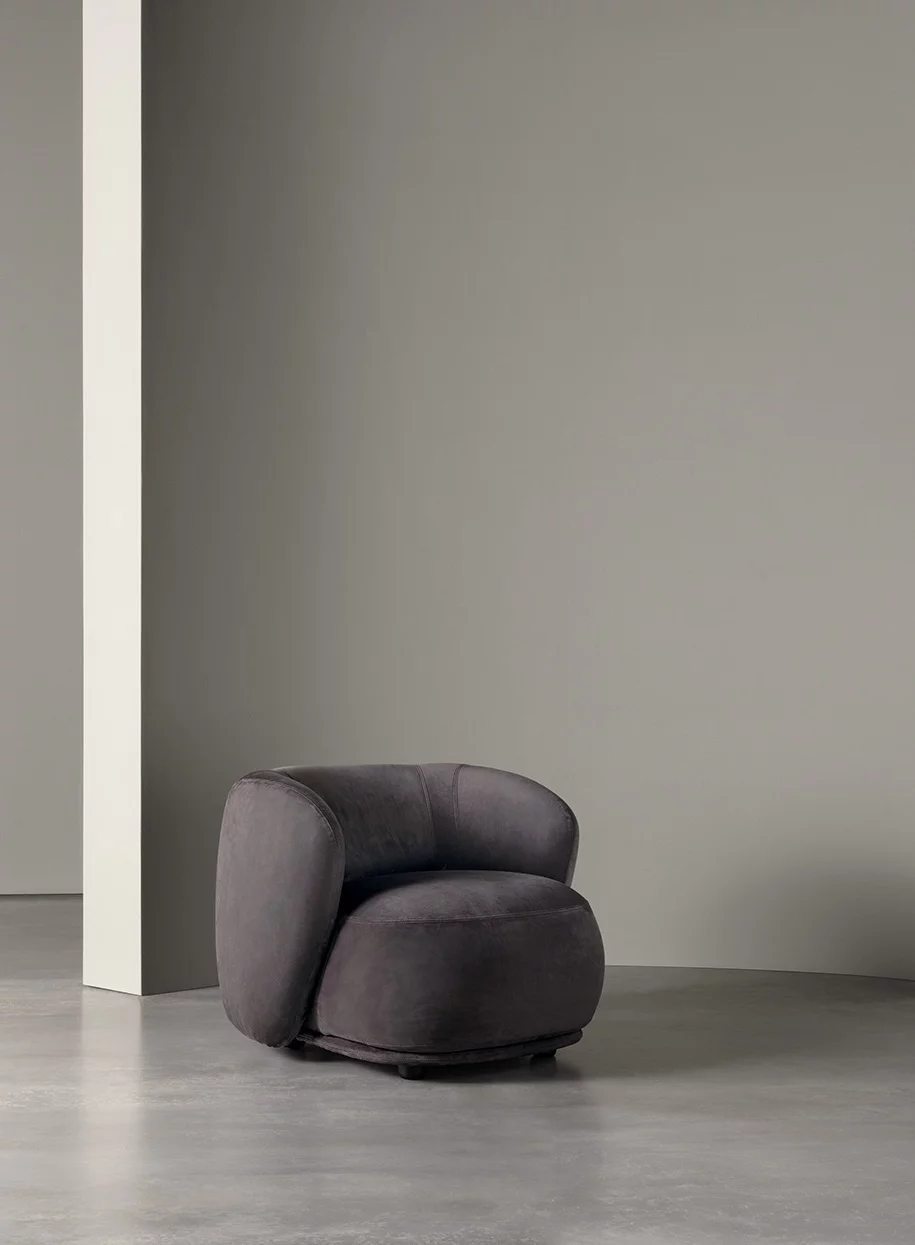 Afgeleid van de René sofa, biedt deze compacte fauteuil een knusse, nestachtige omhelzing. De organische, afgeronde vormen en luxe stoffering maken het een elegante keuze voor elke ruimte.