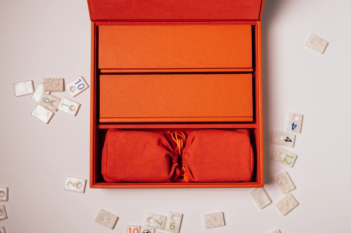 De Rummikub Orange van House of Nobilique herdefinieert een klassieker in pure luxe. Handgemaakt van premium echt leer met een natuurlijke nerf, is iedere set uniek gemarkeerd — geen twee exemplaren zijn hetzelfde. Dit is vakmanschap dat je ziet én voelt.