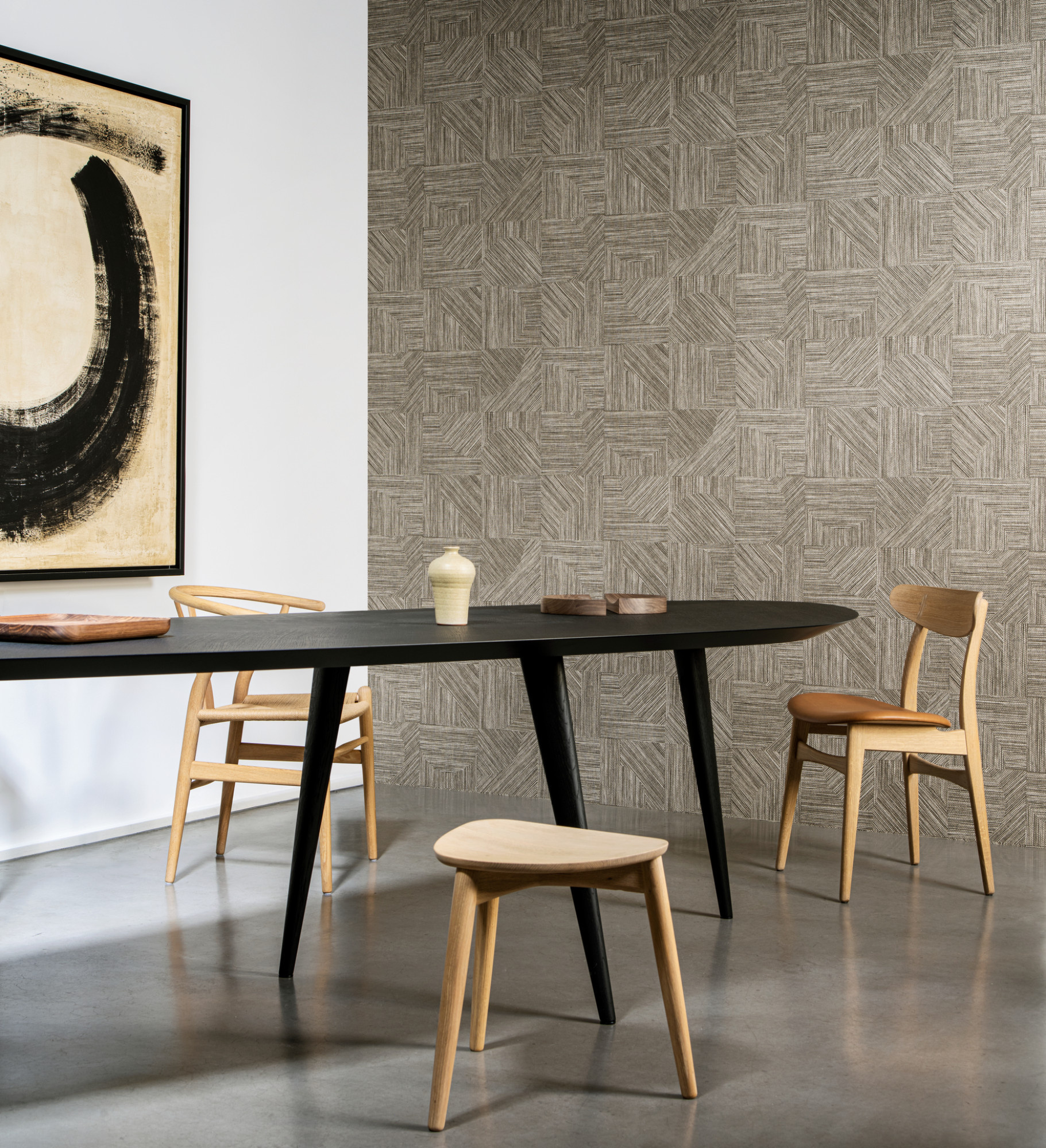 Wat grovere, open geweven grassen, met de hand uitgesneden en ingelegd, vormen de inspiratiebron voor dit dessin. Het onregelmatige patroon van asymmetrische vormen voelt meteen erg natuurlijk aan.