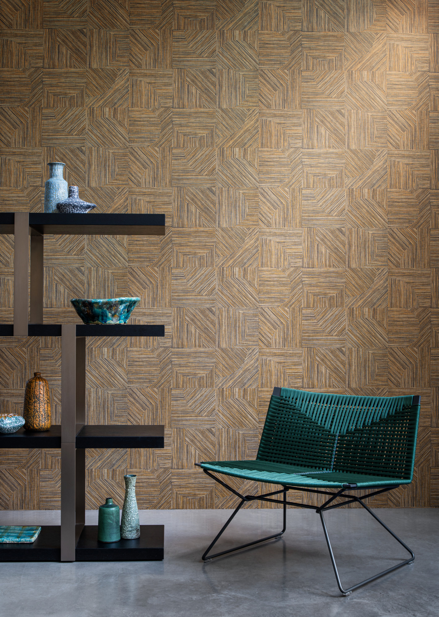 Wat grovere, open geweven grassen, met de hand uitgesneden en ingelegd, vormen de inspiratiebron voor dit dessin. Het onregelmatige patroon van asymmetrische vormen voelt meteen erg natuurlijk aan.