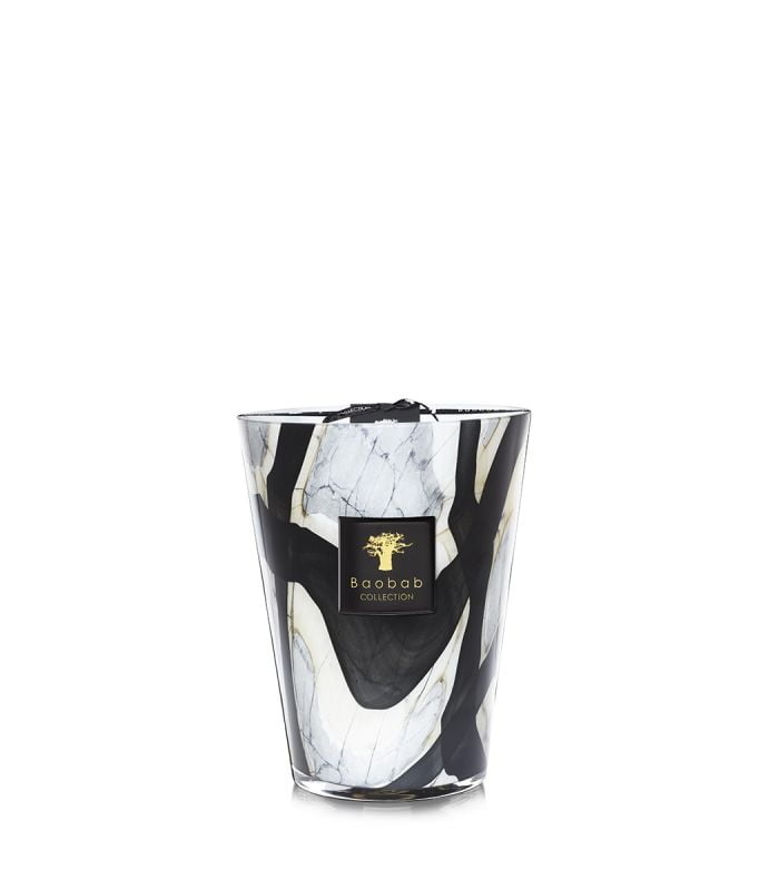 De geparfumeerde kaars Marble is verschenen in een mondgeblazen glas met een gemarmerde grijze achtergrond bezaaid met zwarte lijnen omrand met beige. De elegantie van het glas onthult de vlam die het effect geeft van een lichtgevend stenen object. Zijn p