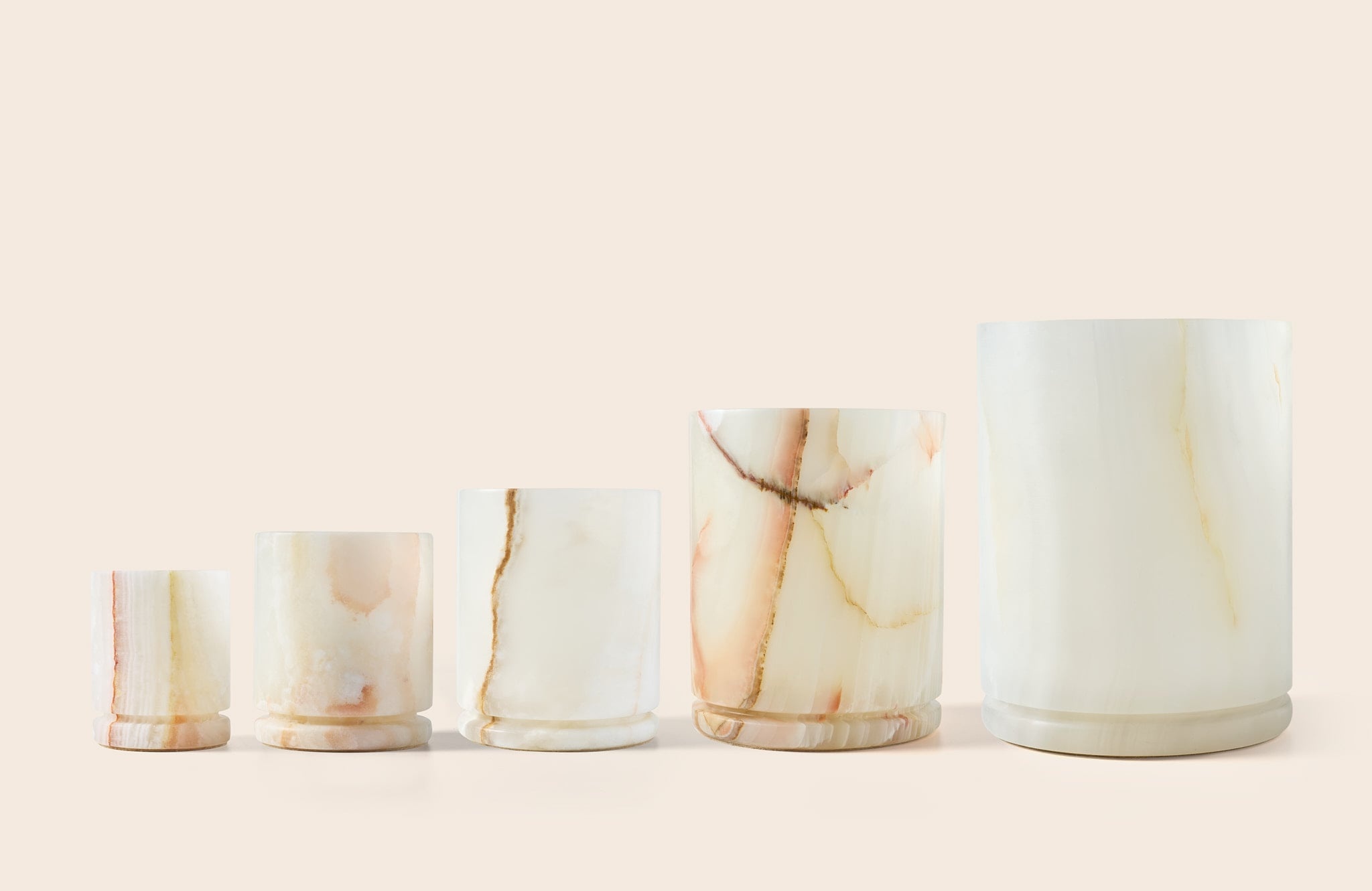 De heldere witte tinten en subtiele aders geven elke houder een unieke, serene uitstraling. Het licht dat door de steen speelt, voelt bijna therapeutisch — alsof je kamer opgelicht wordt door zachte ochtendzon. Perfect voor je woonkamer, badkamer of slaapkamer; overal waar je een kalmerende sfeer wilt creëren.