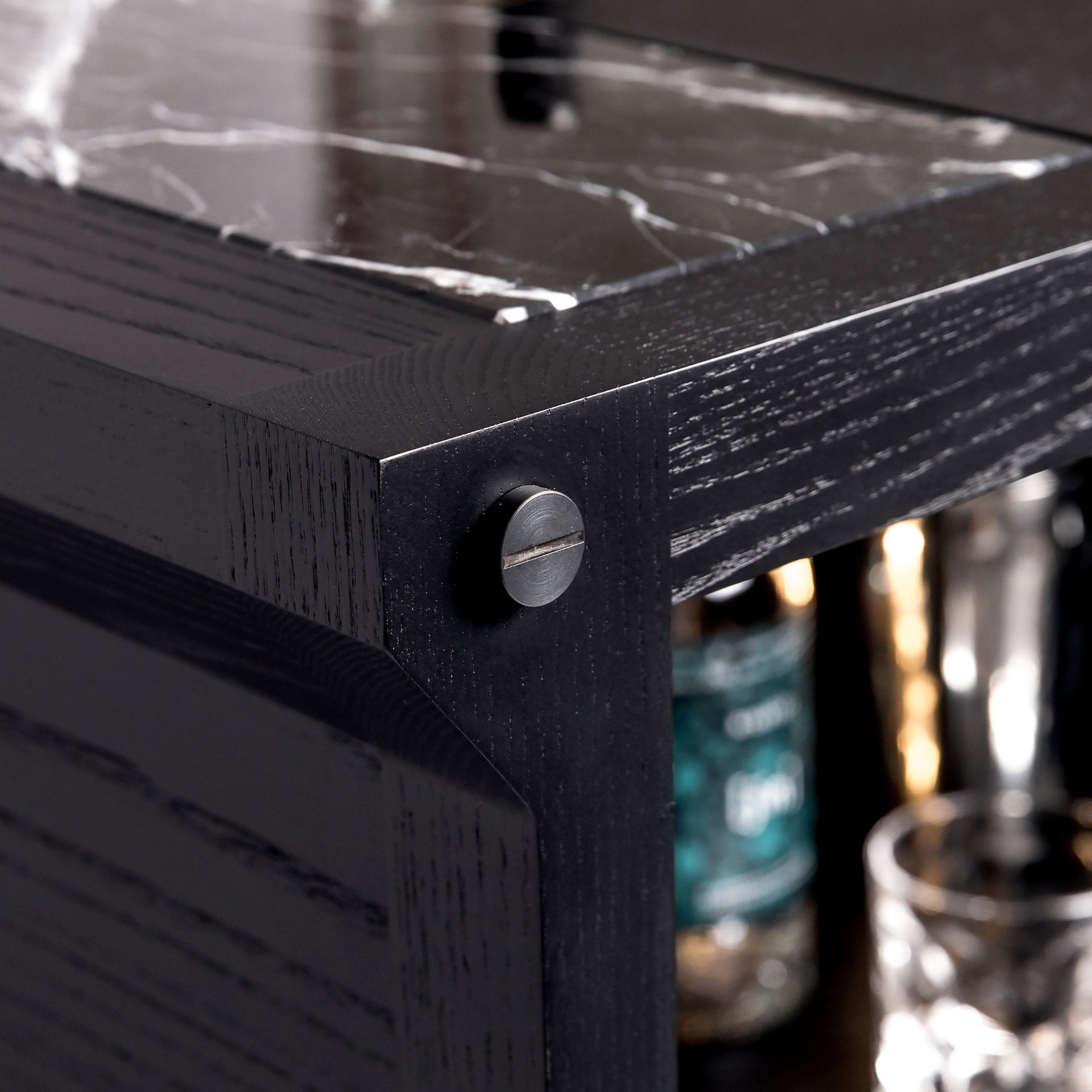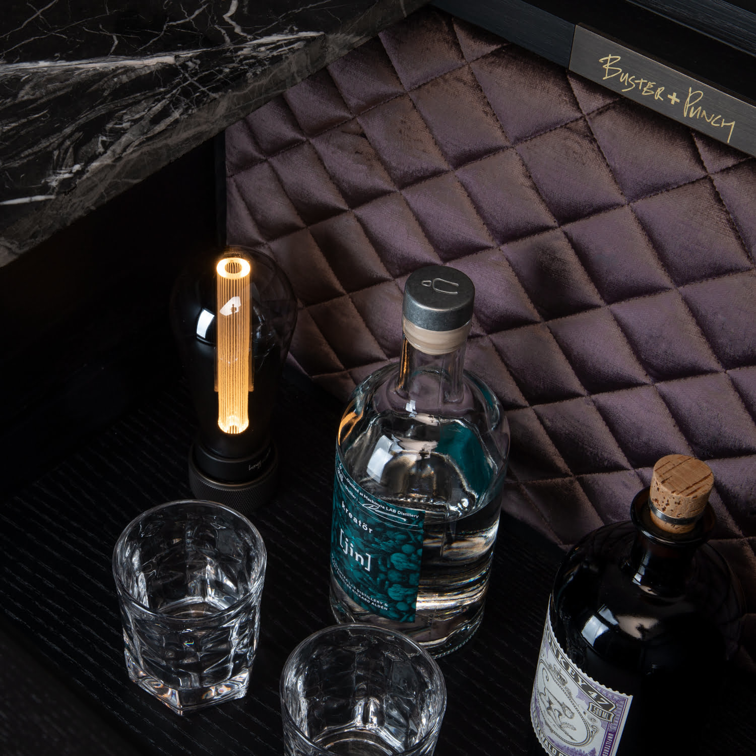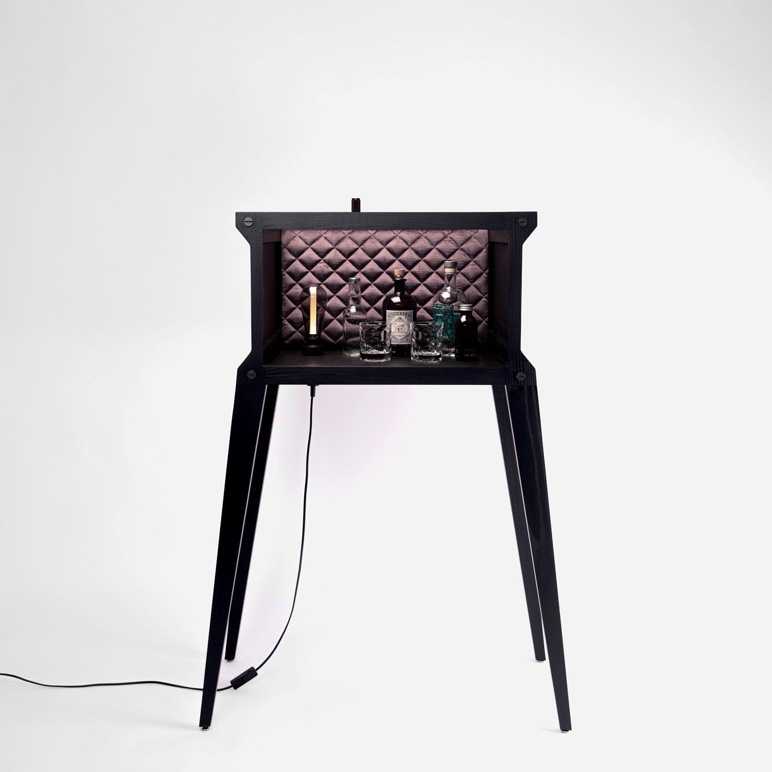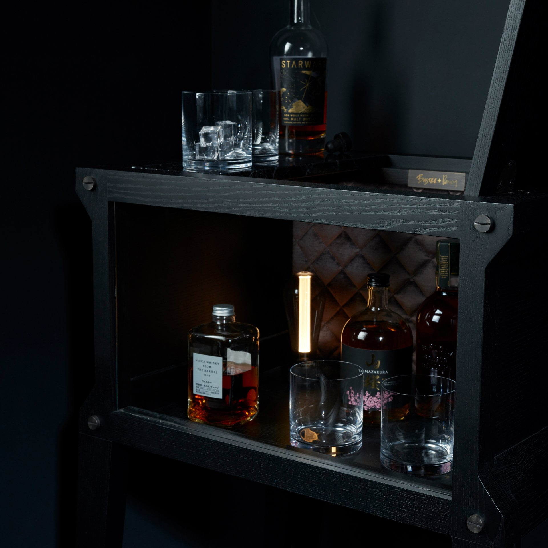 De Popstar gin en cocktailbar is handgemaakt van massief zwart eiken. De bar heeft een doorgestikt rugpaneel van grijs bessenzijde en is voorzien van een gekarteld massief rookbrons armatuur.