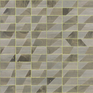 Rechthoeken gemaakt van houtfragmenten, ingelegd op metaalfolie. De folie benadrukt het patroon en zorgt voor een verfijnde afwerking. Zachte en ingetogen kleuren enerzijds en intensere tinten anderzijds, maar zonder afbreuk te doen aan de uitgesproken natuurlijke look & feel van het hout.